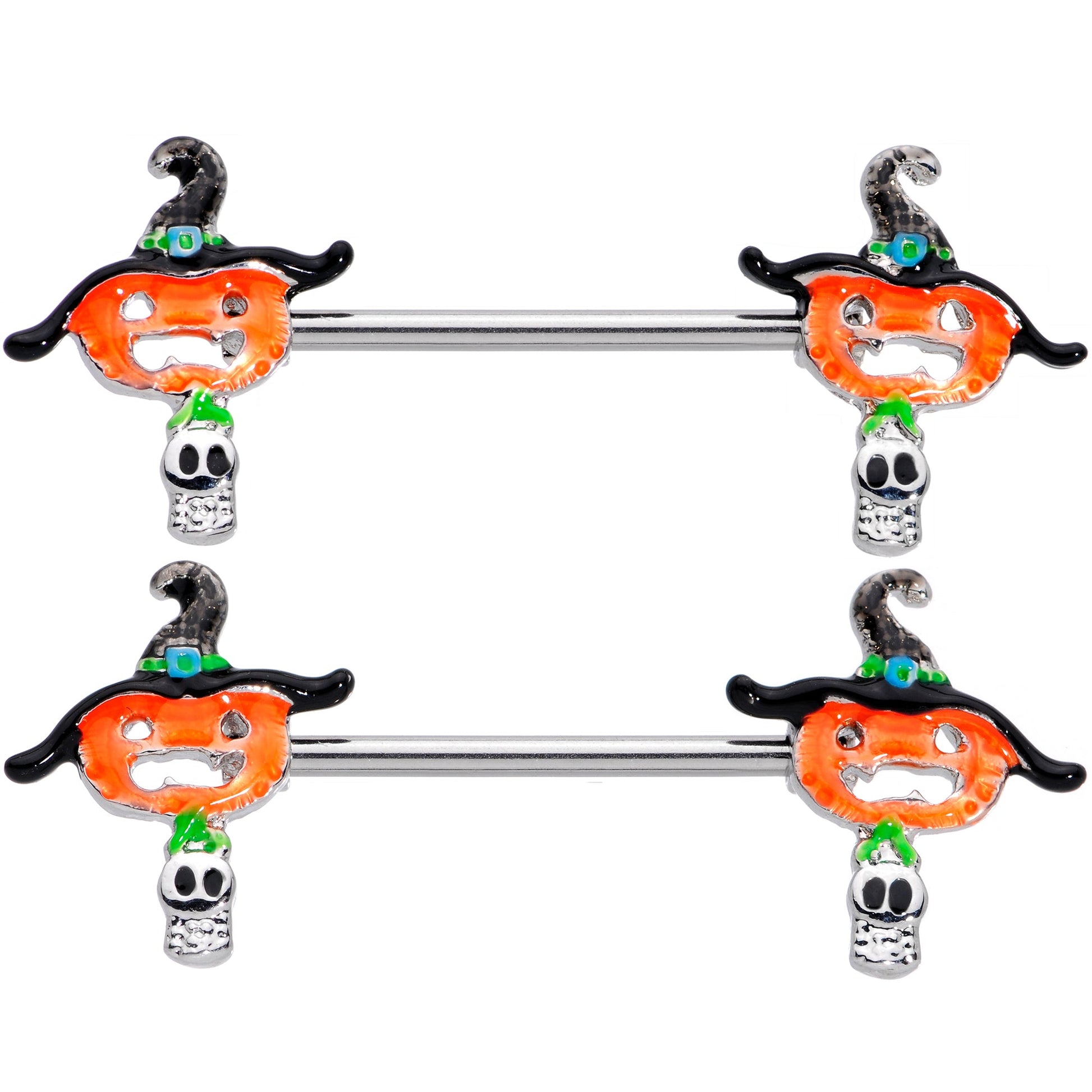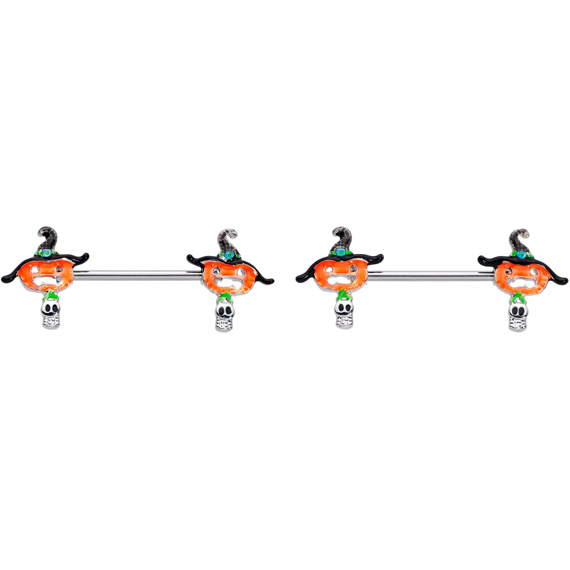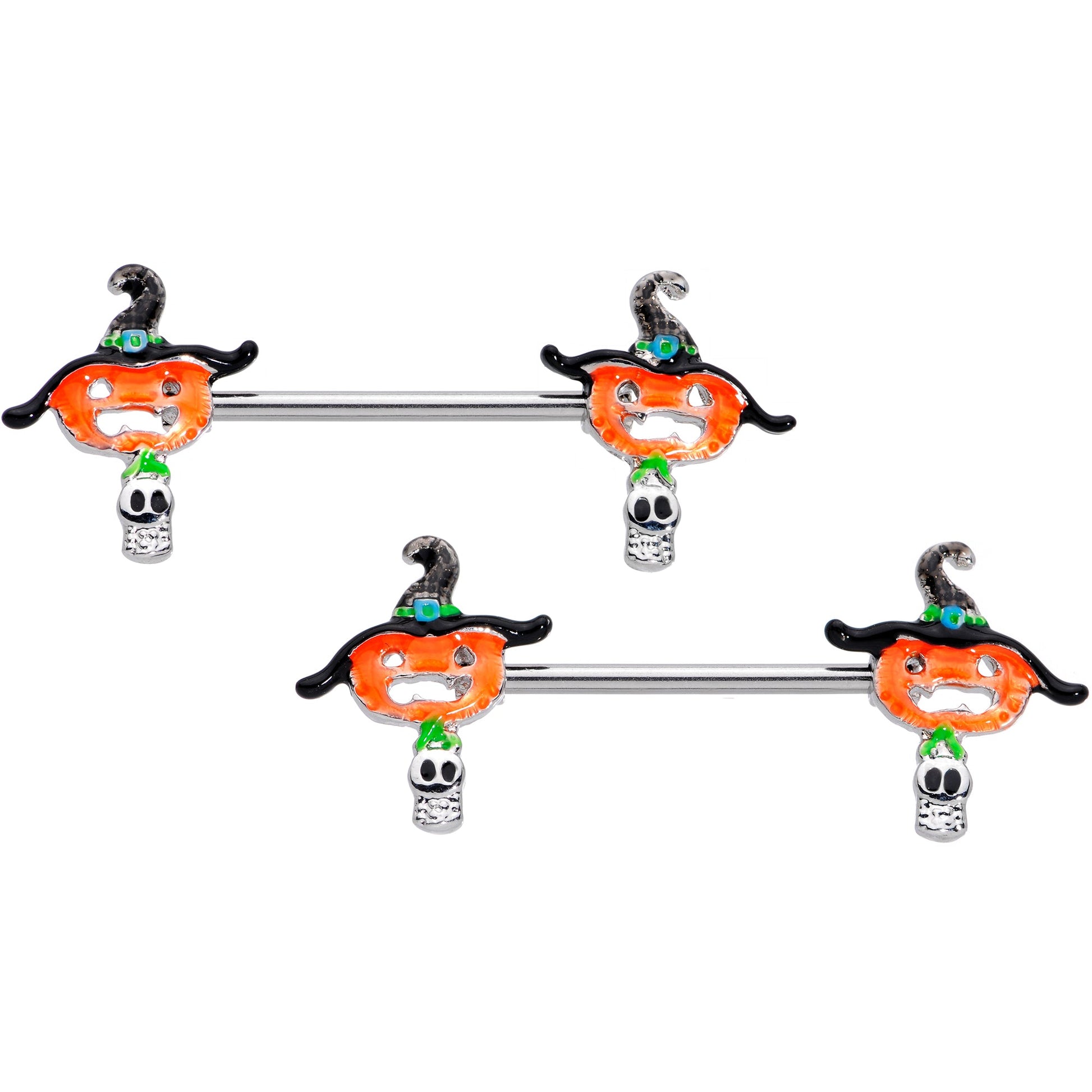 14 Gauge 9/16 Pumpkin Witch Ghost Halloween Barbell Nipple Ring Set