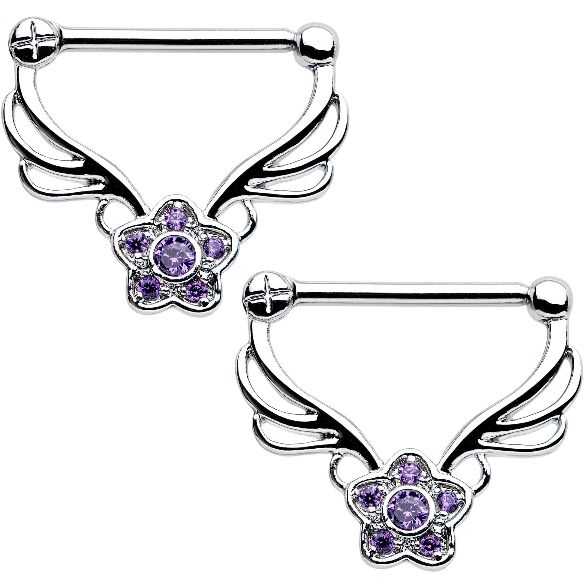 Power up with this beautiful nipple clicker set. Each nipple clicker features a purple gem encrusted star mounted on a fancy metalwork design. This 14 gauge nipple ring set features 14mm long straight hinged barbells made from durable 316L surgical grade stainless steel for easy insertion and removal from your nipple piercing. Sold as a set of two for you!