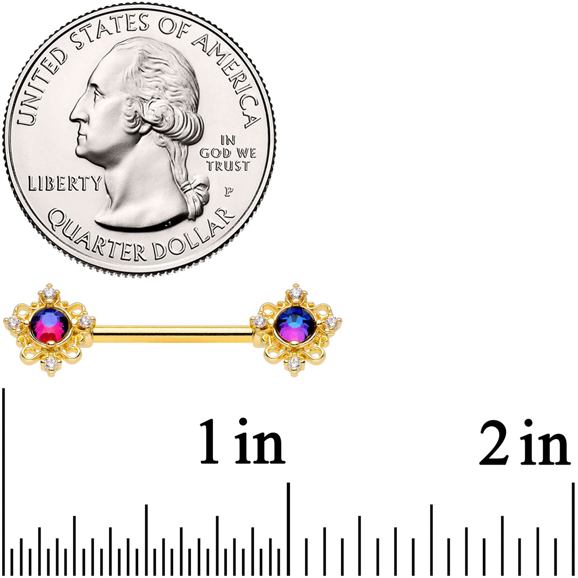 If this 14 gauge nipple jewelry could talk, it would tell you that you are the loveliest of lovelies when you're wearing it! It's made with 14mm gold tone PVD over 316L surgical grade stainless steel straight barbells. Each of the ends features a purple tourmaline charm set in an openwork circle. The circle is set with small clear cubic zirconia gems for an added touch of elegance that's fit for fairy tale royalty! You'll be feeling gorgeous and ready to rule with these fetching filigree nipple rings! Sold as a set of two.Specifications