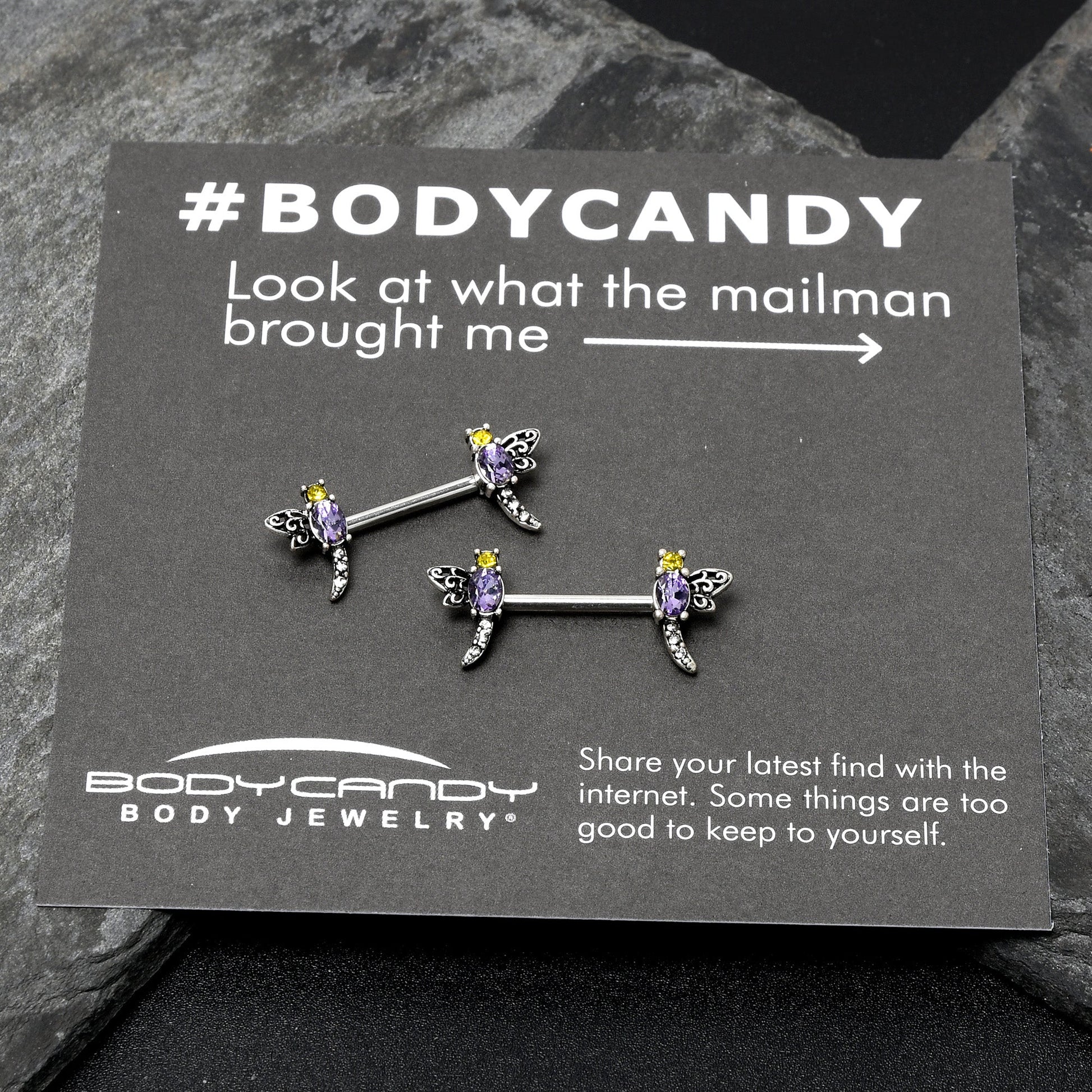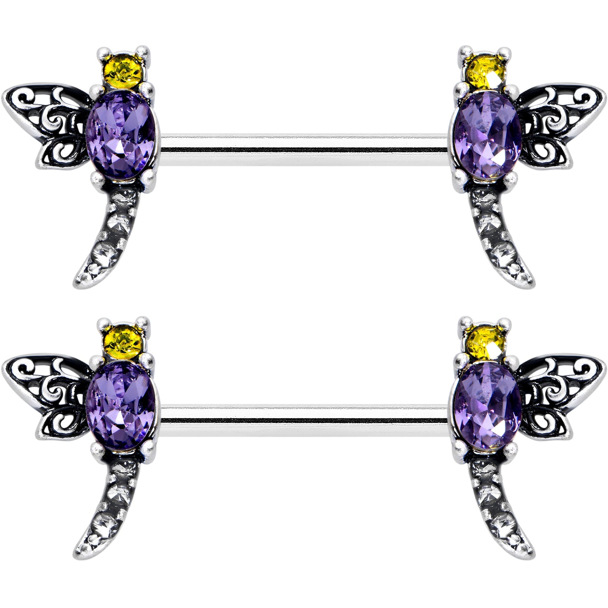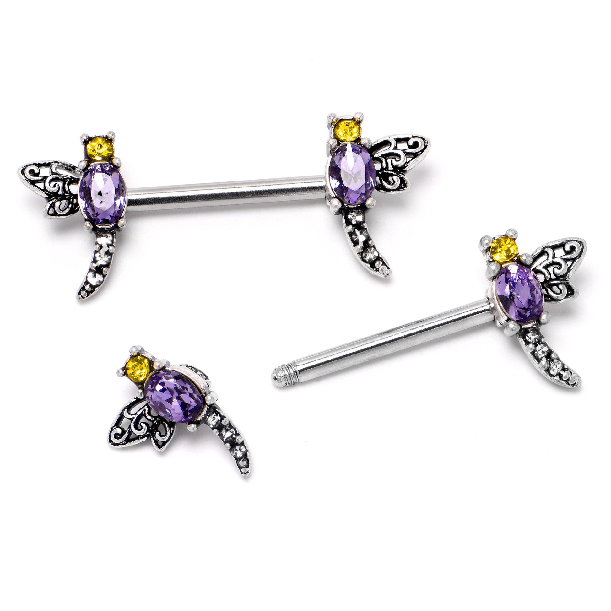14G 9/16 Purple Yellow Gem Dragonfly Barbell Nipple Ring Set