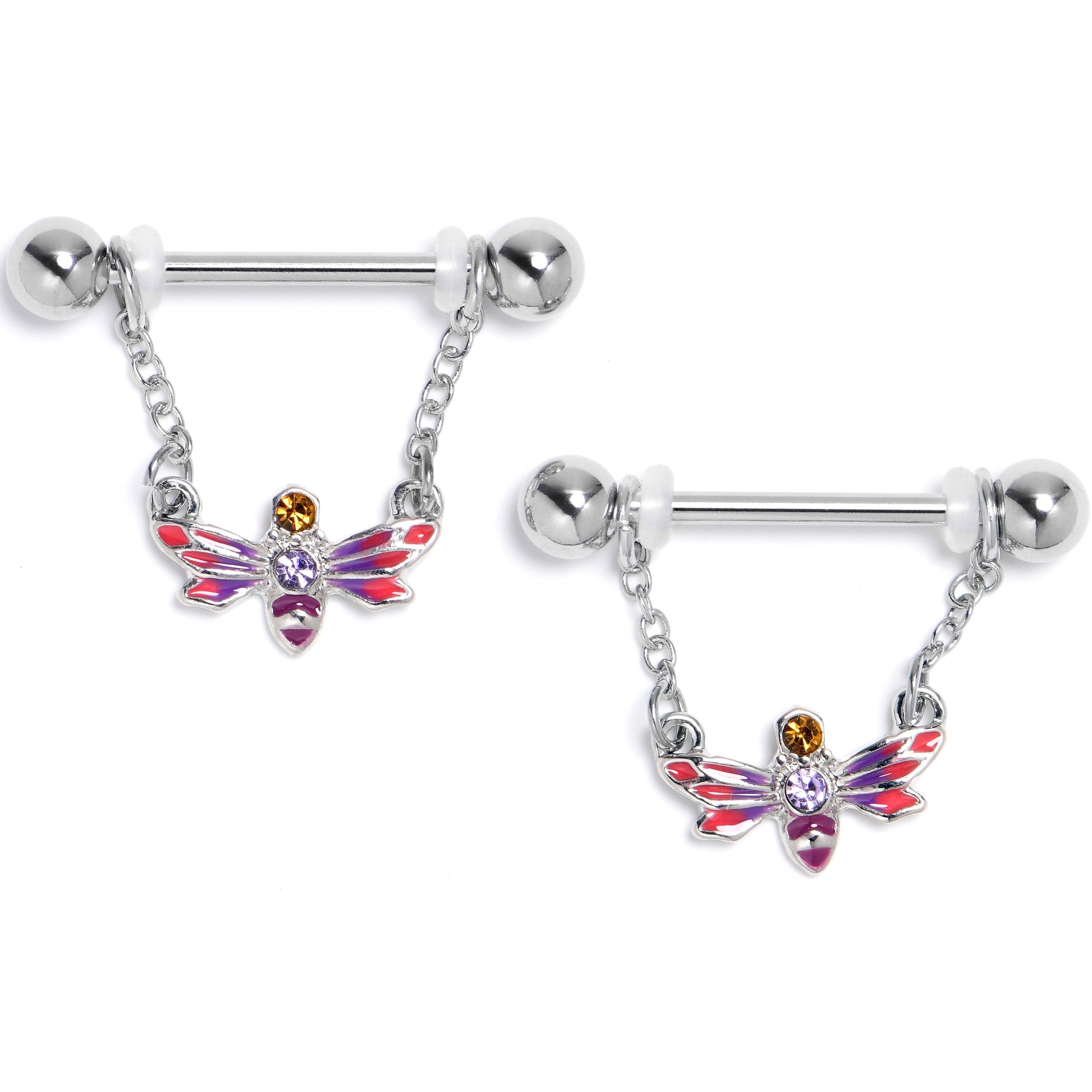 The delightful dragonflies on this 14 gauge nipple jewelry are so lovely it is almost magical. It is made with 14mm durable 316L surgical grade stainless steel straight barbells with 5mm ball end. Each barbell supports a double length of matching chain that features a dragonfly charm, with striped bodies and wings for lovely touches of color. They also feature purple and yellow gem embellishments for added glamour that will cast a spell on you. Give your look a touch of nature with these delicious dragonfly nipple piercing rings. Sold as a set of two.Specifications