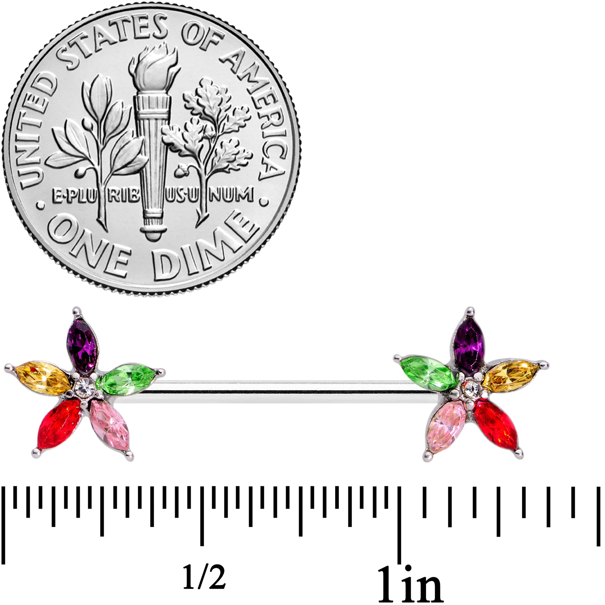 The flowers on this 14 gauge nipple jewelry will make your nipple piercings into stars! They're made with 14mm durable 316L surgical grade stainless steel straight barbells. Each of the ends is a flower charm with cats-eye shaped petals that are reminiscent of a star's rays, and each petal is a single gem in purple, yellow, green, red, and pink. There's even a clear gem at each flower's center for a colorful and whimsical appearance. This elegant flower nipple jewelry will have you seeing stars! Sold as a set of two.Specifications