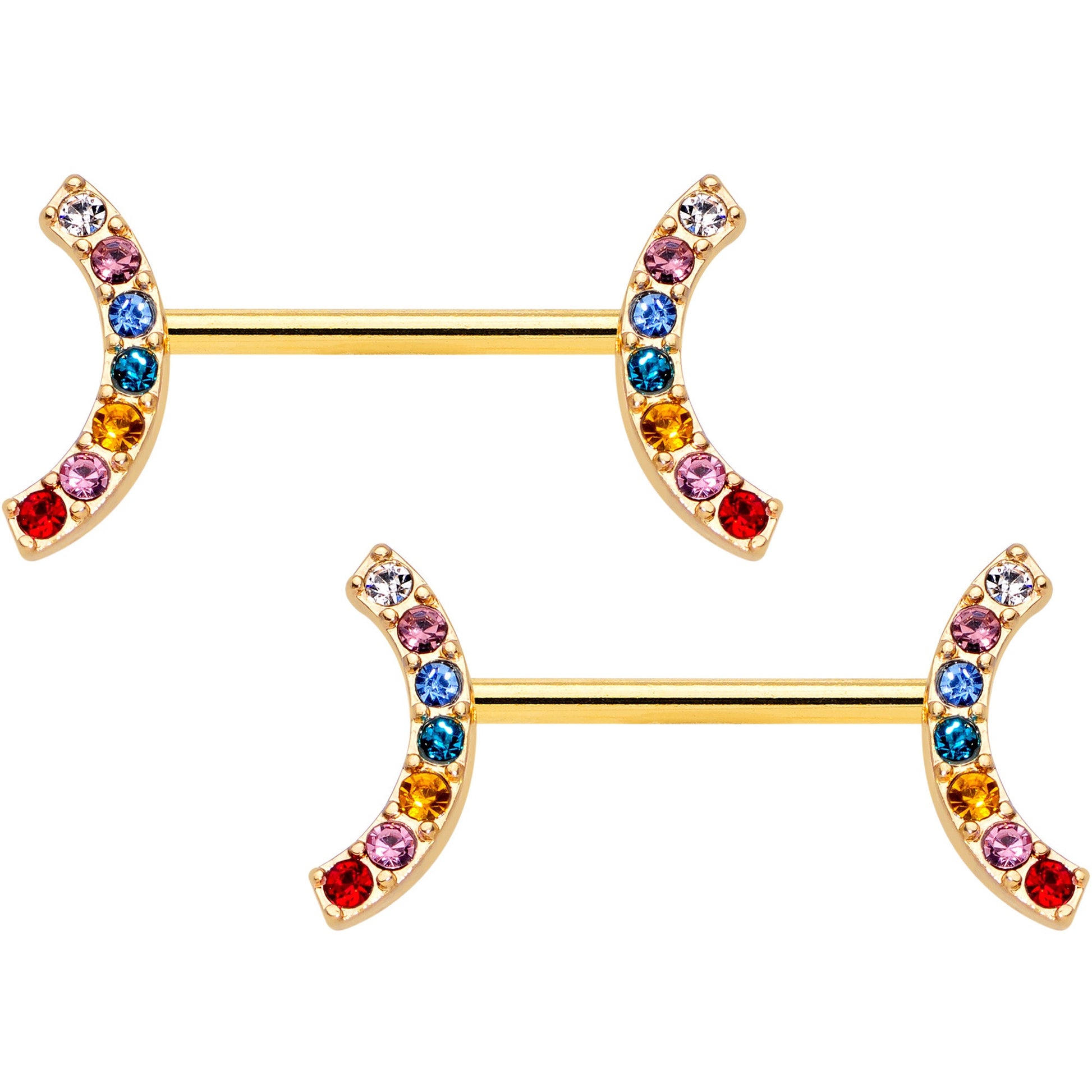 Why wait for a rainy day to find a rainbow when you can wear one all the time with this 14 gauge nipple jewelry? It's made with 14mm gold tone PVD over 316L surgical grade stainless steel straight barbells. Each end features a charm of a simple arch, composed entirely of single gems. Red, pink, yellow, shades of blue, purple, and a clear gem are all represented in these elegantly simple but captivatingly colorful nipple rings. Let all the colors come out to play with this vibrant nipple piercing jewelry! Sold as a set of two.Specifications