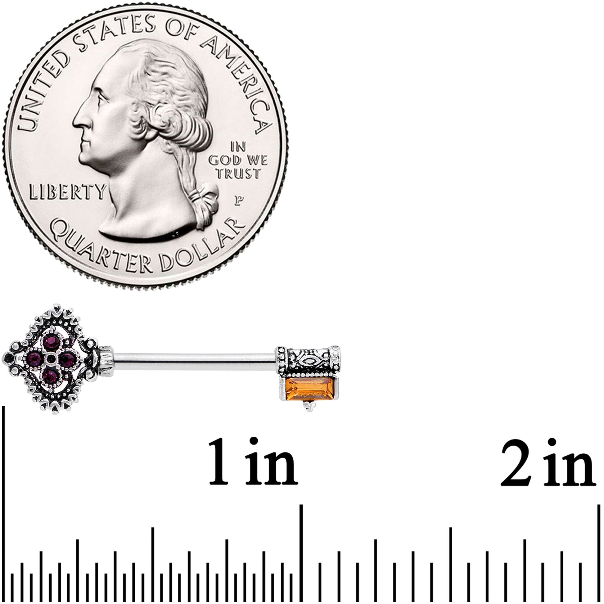 It may be the king's key but this 14 gauge nipple jewelry is perfectly suited for a queen! It's made with 14mm durable 316L surgical grade stainless steel straight barbells. One end features the key bow charm set with small red gems. The other end is the key's bit set with a rich brown gem that adds color and visual appeal. You'll feel like royalty with these in your nipple piercings! Sold as a set of two.Specifications