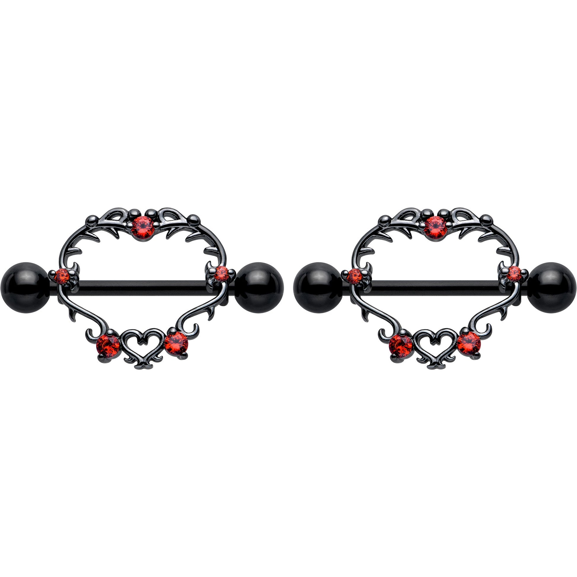 Get a look you'll never leaf behind with this 14 gauge nipple jewelry. It's made with 14mm black PVD over 316L surgical grade stainless steel straight barbells with 5mm ball ends. The shield portions feature a leafy vine design that forms a large heart. The hearts are each embellished with textured ornamentation and red cubic zirconia gems for a pop of color you'll love. These nipple piercing rings are sure to grow on you. Sold as a set of two.Specifications