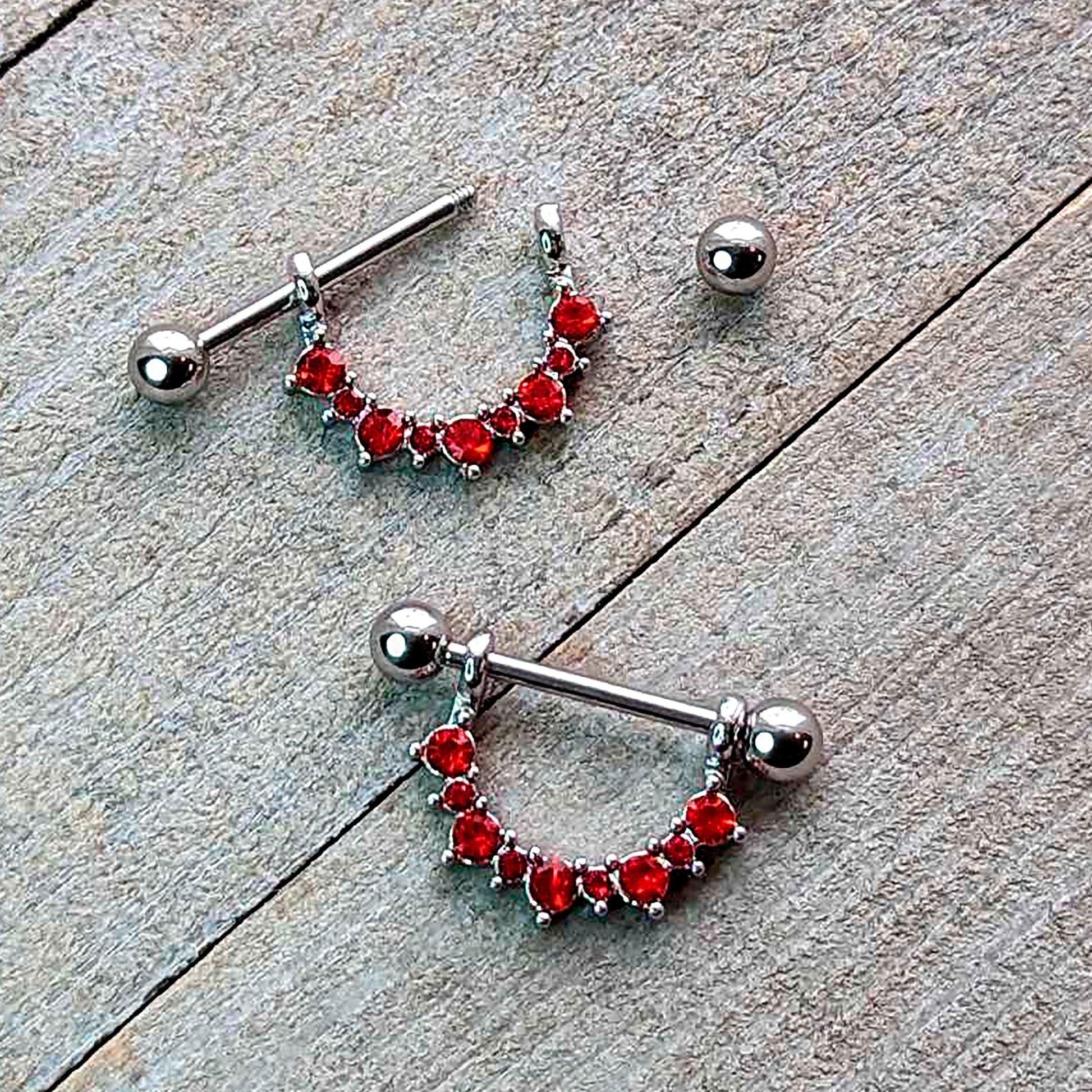 Party like it's your birthday all year long when you are rocking this 14 gauge nipple jewelry. It is made with 14mm durable 316L surgical grade stainless steel straight barbells with 5mm ball ends. Each one features a dangle arch design composed of red cubic zirconia gems that emulate the birthstone for the month of January. Get festive and fabulous all year long with these charming nipple piercing rings. Sold as a set of two.Specifications