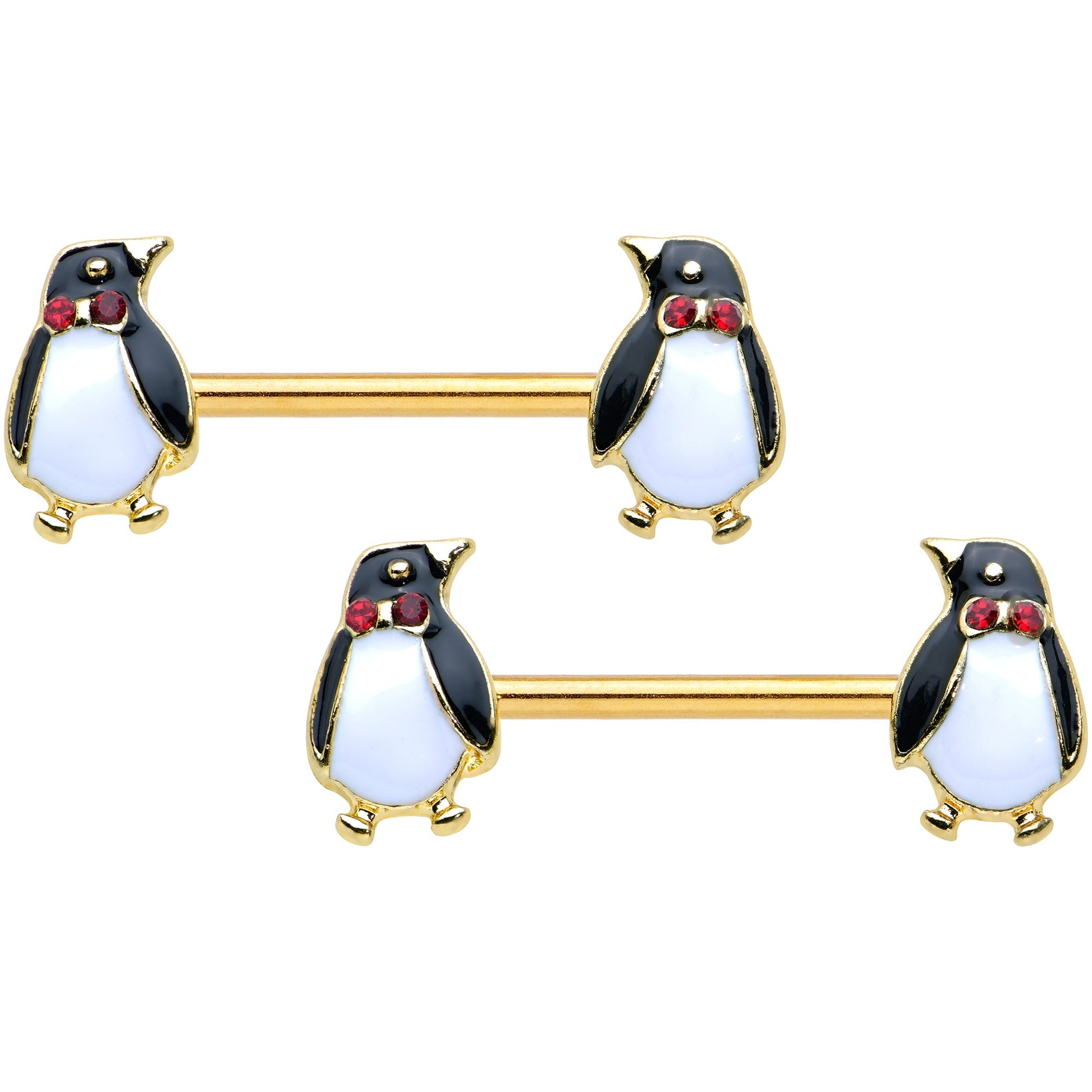 Keep cool this holiday season with this fun 14 gauge nipple jewelry with winter style! It's made with 14mm gold tone PVD over 316L surgical grade stainless steel straight barbells. Each of the ends features a penguin charm, wearing fashionable bow ties with red gem embellishments. It's never too cold to look fabulous with these polished-looking penguin nipple piercing rings! Sold as a set of two.Specifications