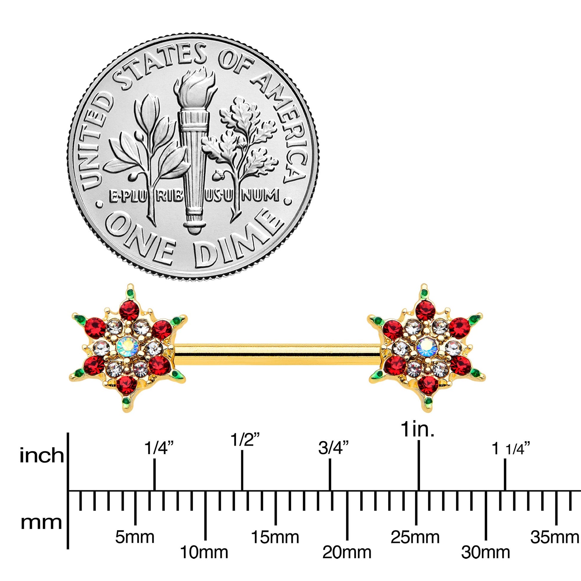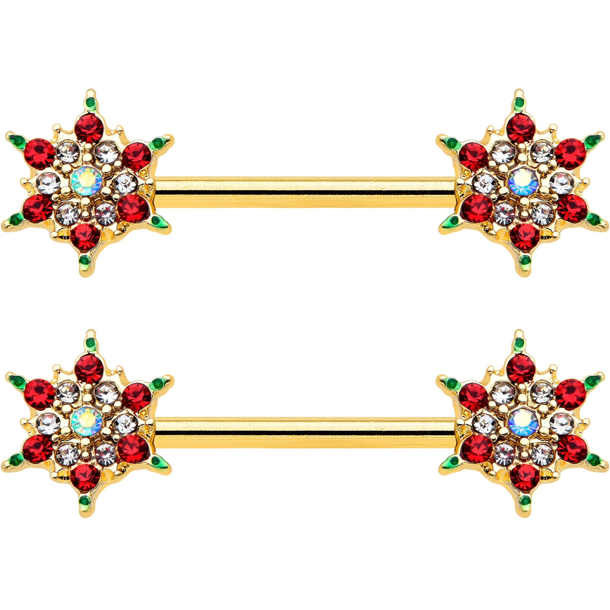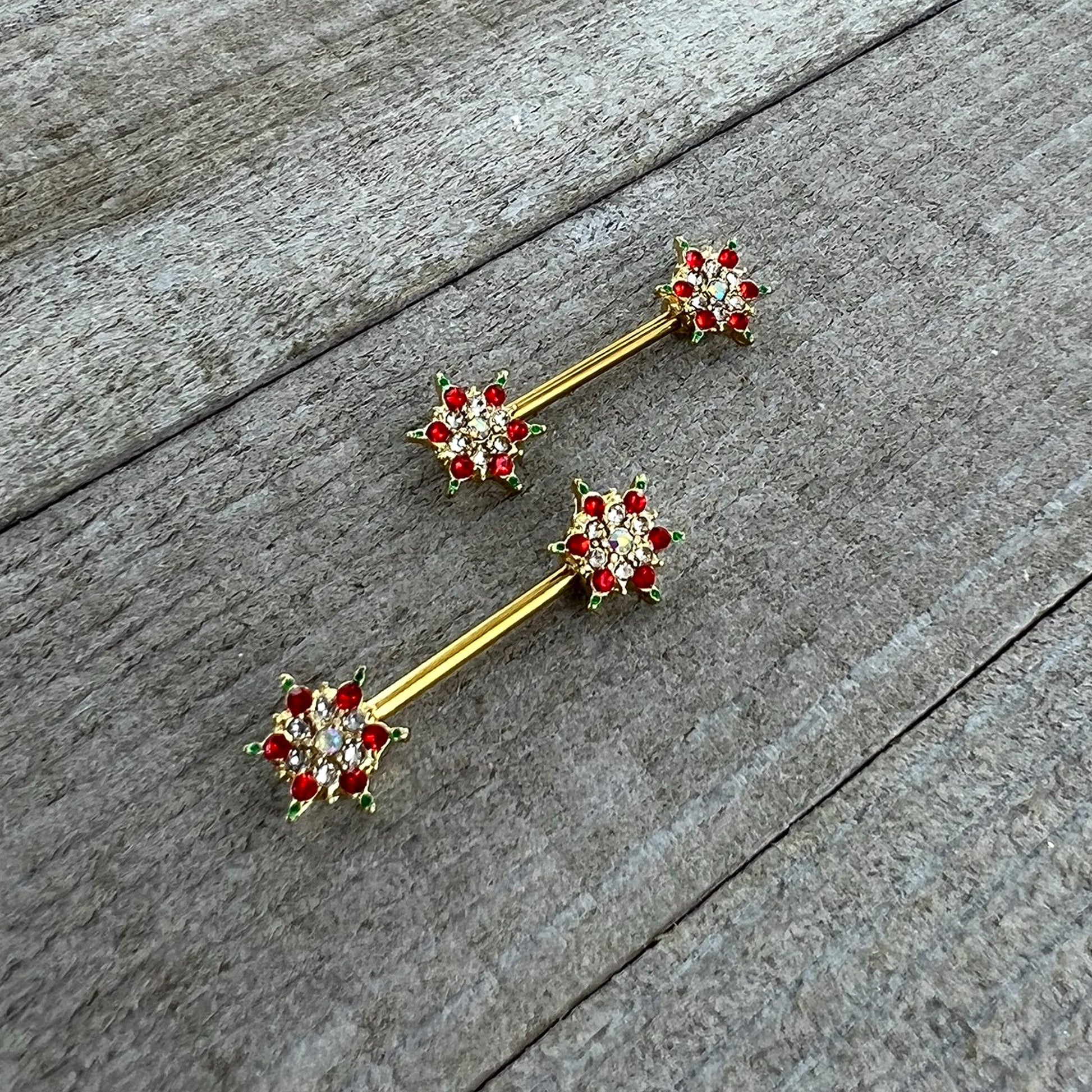 Even if you're not rolling in cash, you can look super rich when you're rocking this 14 gauge nipple jewelry this Christmas! It's made with 14mm gold tone PVD over 316L surgical grade stainless steel straight barbells. Each of the ends features a snowflake charm with rich red gem and green embellishments, connected with a ring of clear gems and finished with an aurora gem center. Whether you're rich or just have upscale taste, these holiday nipple piercing rings will make you feel like a million bucks! Sold as a set of two.Specifications