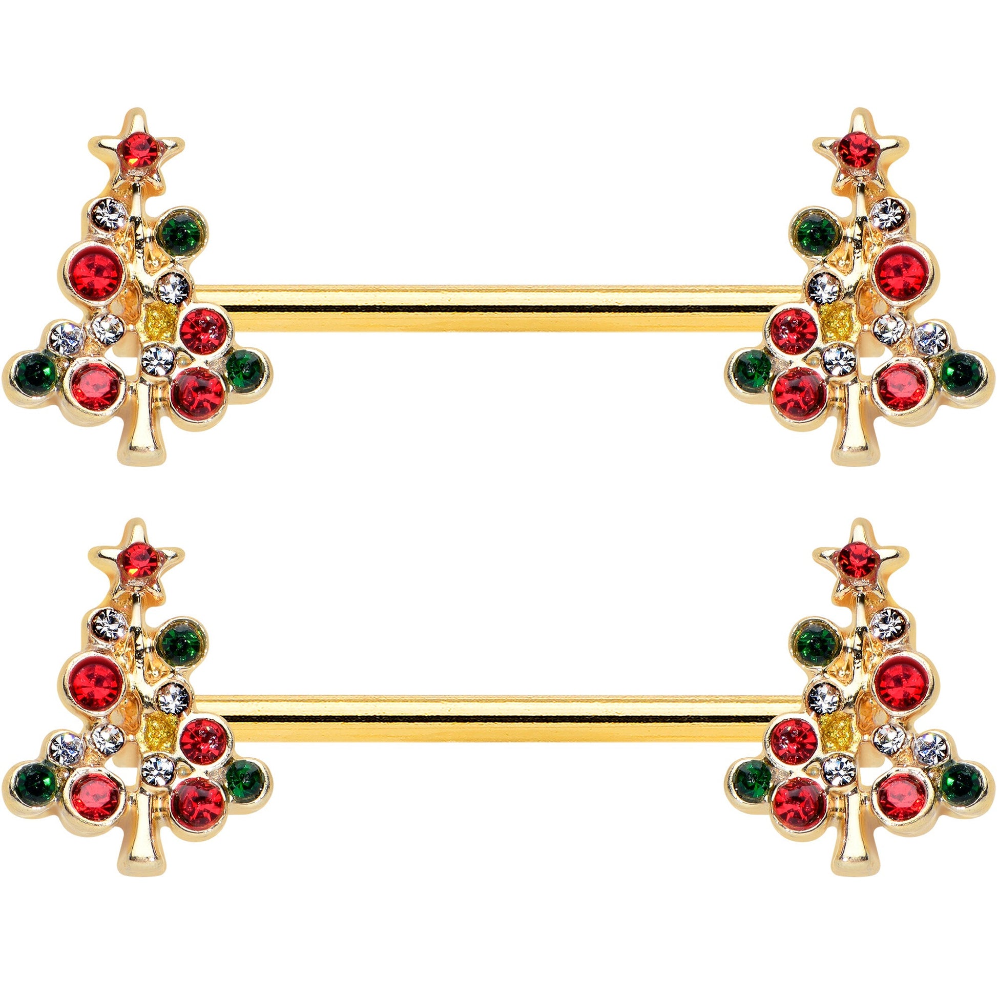 Oh, Christmas trees, you look so lovely on this 14 gauge nipple jewelry! It's made with 14mm gold tone PVD over 316L surgical grade stainless steel straight barbells. Each of the ends features a Christmas tree charm, composed of festive green, red, and clear gems. It's even topped with a tiny star, which is also set at the center with a red gem. Your look will be all about a merry Christmas with these colorful, festive nipple rings. Sold as a set of two.Specifications