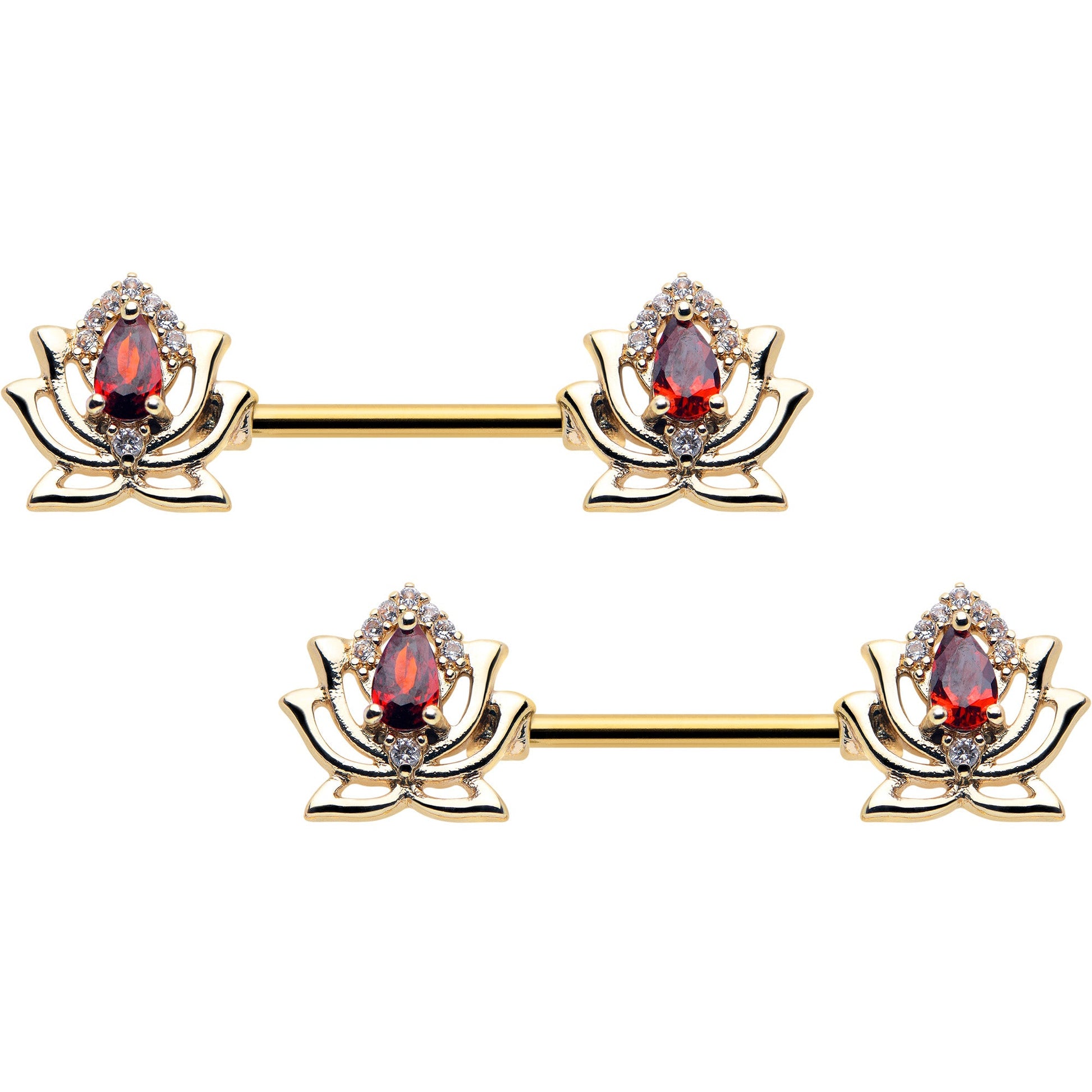 Inner peace is important but so is outer peace - like the kind you get from this 14 gauge nipple jewelry. It is made with 14mm gold tone PVD over 316L surgical grade stainless steel straight barbells. The ends each feature a gorgeous lotus flower charm set with clear gems and featuring deep red gem centers. These lotus flower nipple piercing rings are sure to have you feeling as good as you look. Sold as a set of two.Specifications