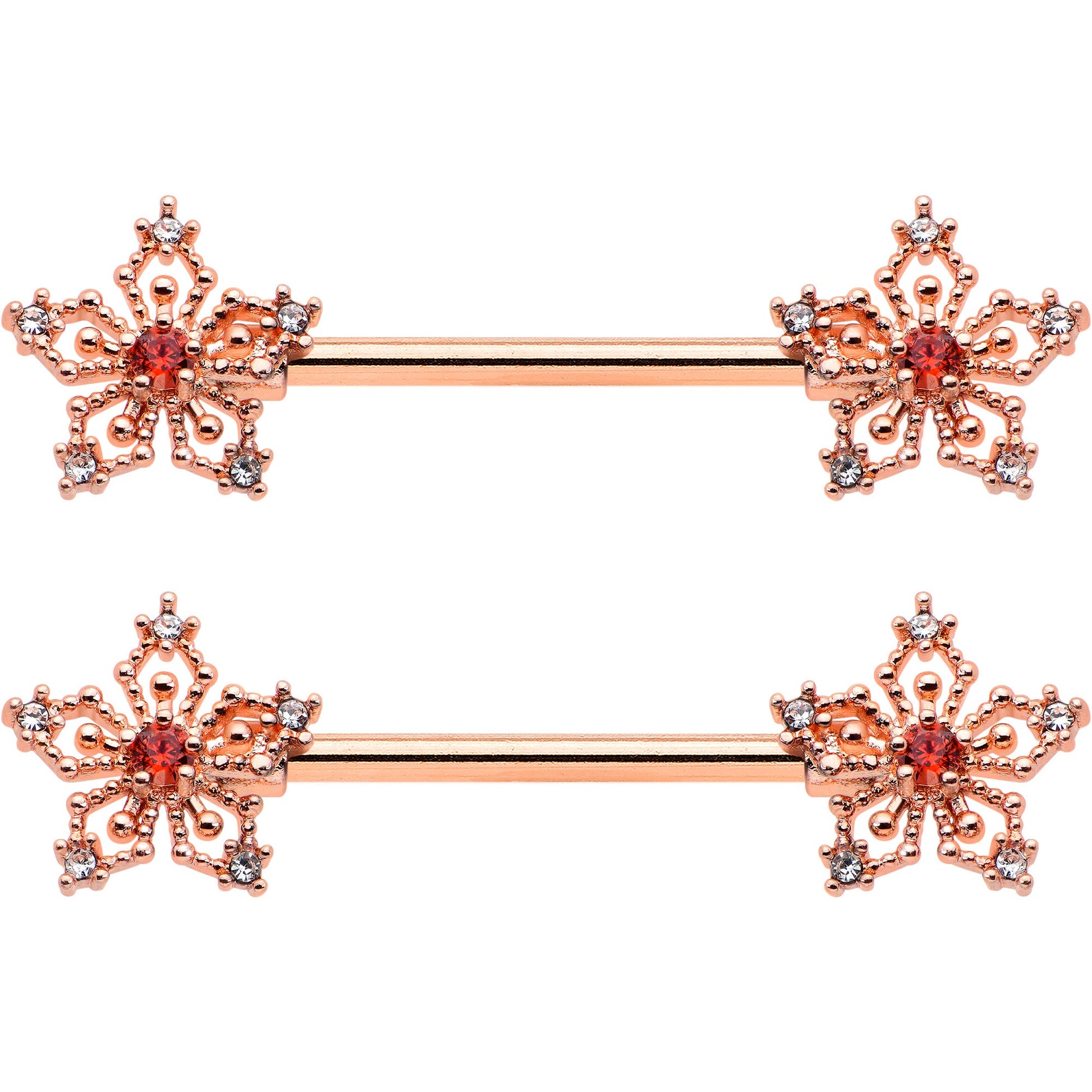 Make your nipple piercings a star this Christmas with this 14 gauge nipple jewelry! It's made with 14mm rose gold tone PVD over 316L surgical grade stainless steel straight barbells. Each of the ends features a snowflake charm, with textured detailing, further embellished with clear gems at the points and a red gem at the center. You'll feel like a star no matter the season with these stylish snowflake nipple piercing rings! Sold as a set of two.Specifications
