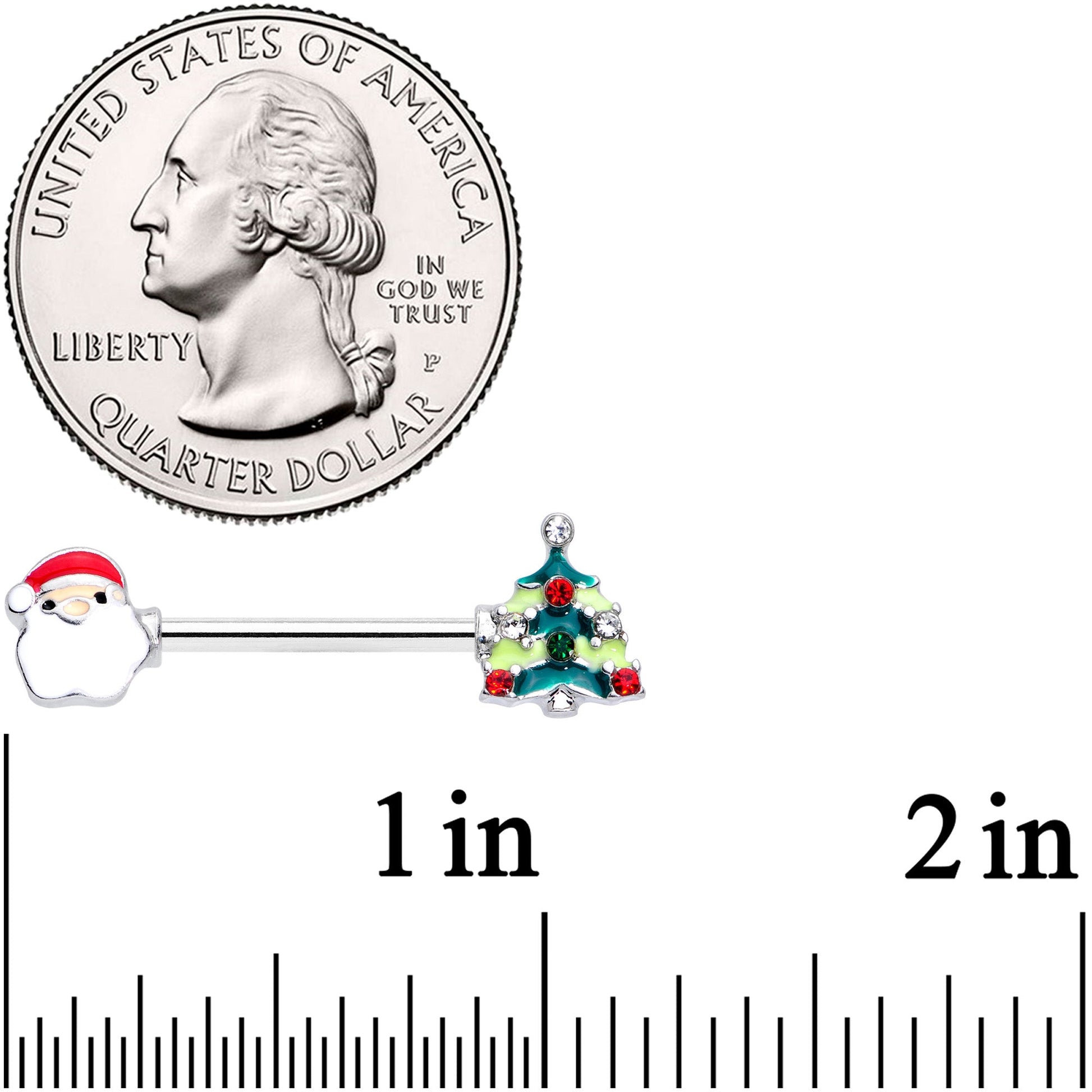 If you love to decorate for the holidays then you will love decorating your nipple piercings with these 14 gauge holiday nipple rings! Made with 14mm durable 316L surgical grade stainless steel straight barbells, this nipple jewelry features a red and white Santa clause charm end and a green Christmas tree charm end with red gems for festive holiday style! Sold as a set of two.Specifications
