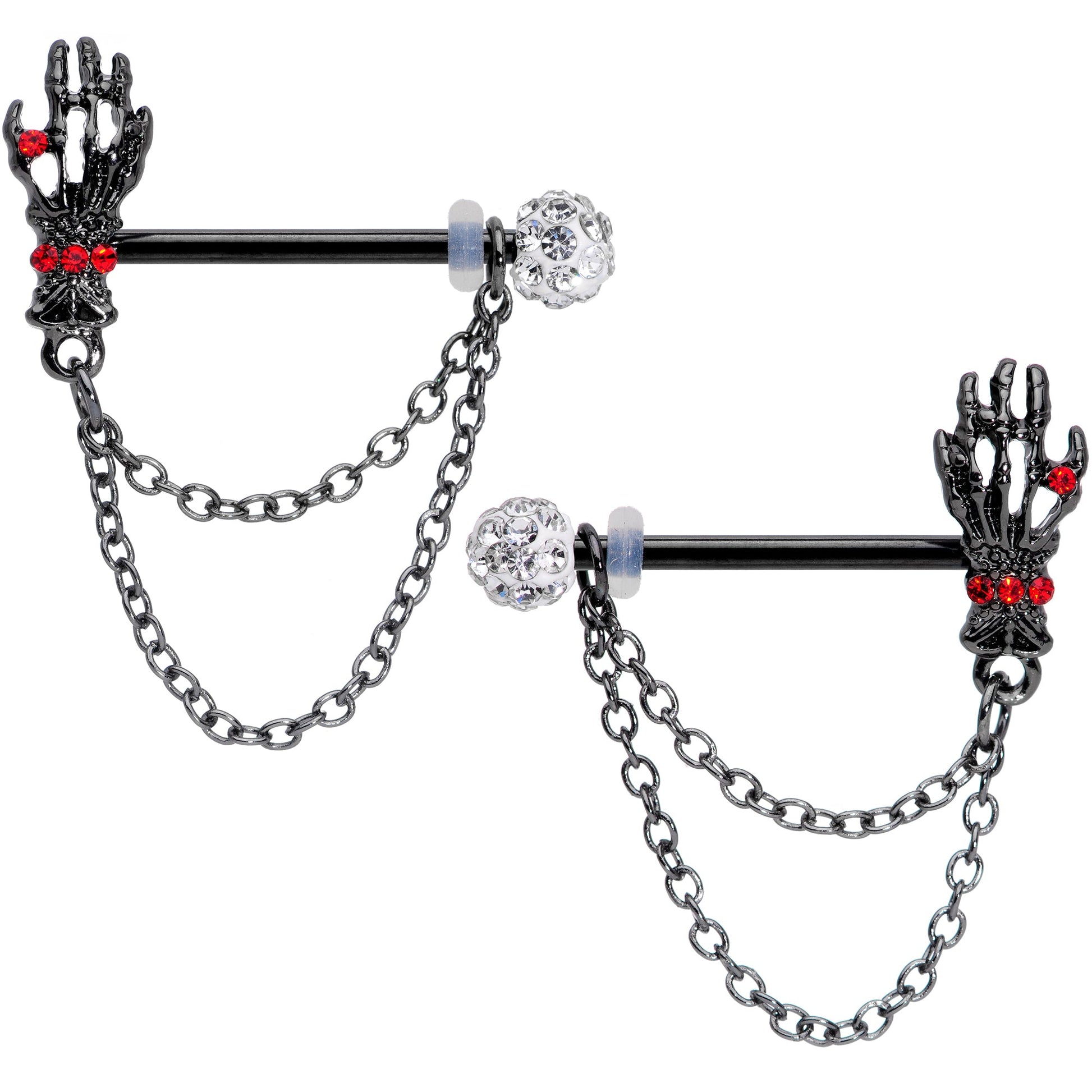 The hands on these 14 gauge nipple rings seem to have come from beyond the grave to bring beauty from beyond! This set of nipple jewelry is made with 14mm black plated over 316L surgical grade stainless steel straight barbells and feature skeletal hand charms with red gems for a touch of otherworldly color! Sold as a set of two.Specifications