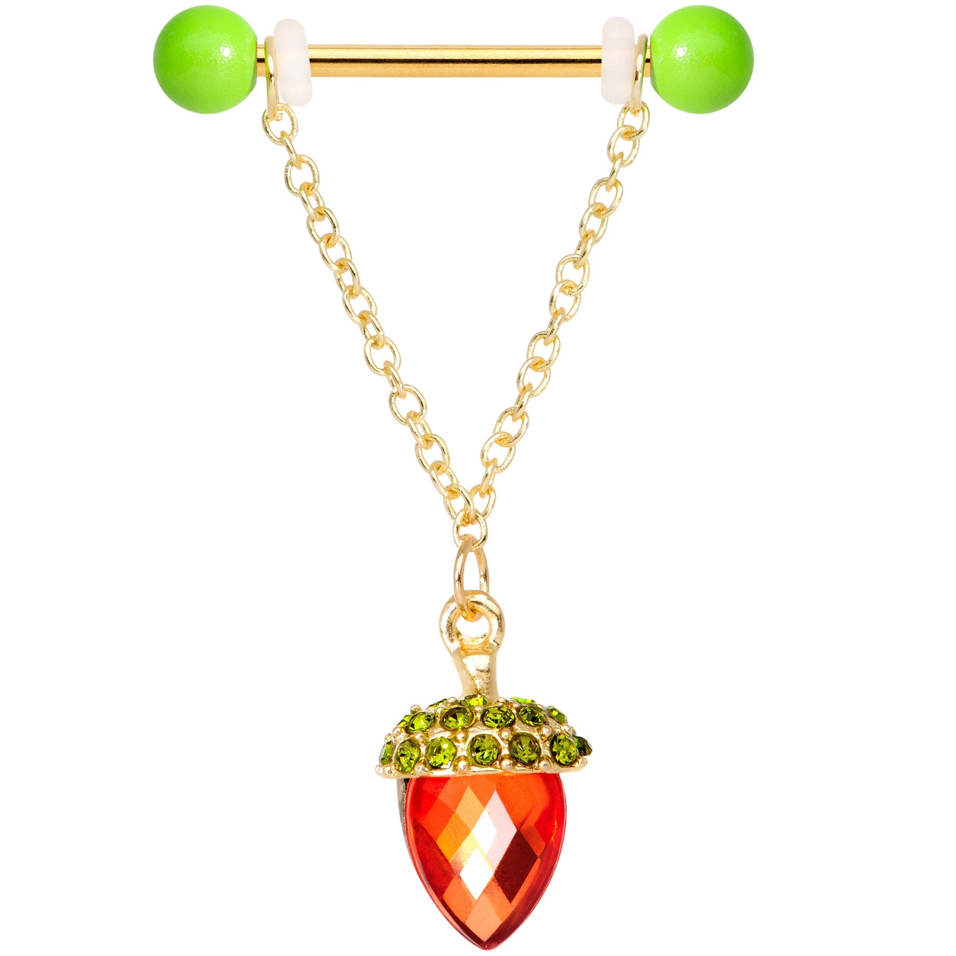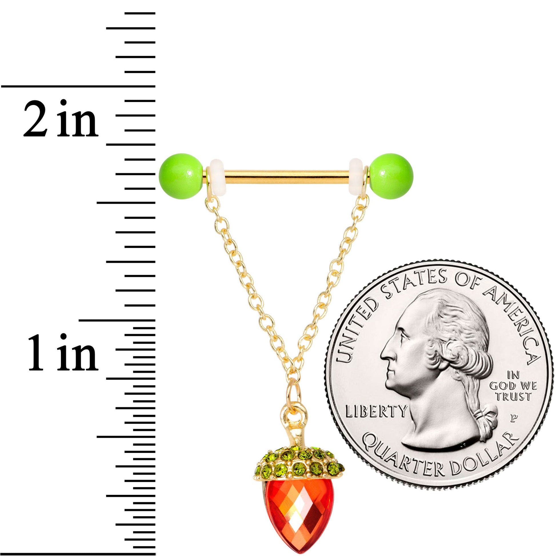 From little acorns, massive oak trees grow....but few acorns are this beautiful! This 14 gauge nipple jewelry is made with 14mm gold tone PVD over 316L surgical grade stainless steel straight barbells with bright green 5mm ball ends. Dangling from one by a pair of chains is an acorn formed from a single red gem with a cap set with tiny green gems. It even has a little stem! Dangling from the mate is a large oak leaf, set with bright green where the veins of real oak leaves are found. Check them out for yourself...they'll grow on you! Sold as a set of two.Specifications
