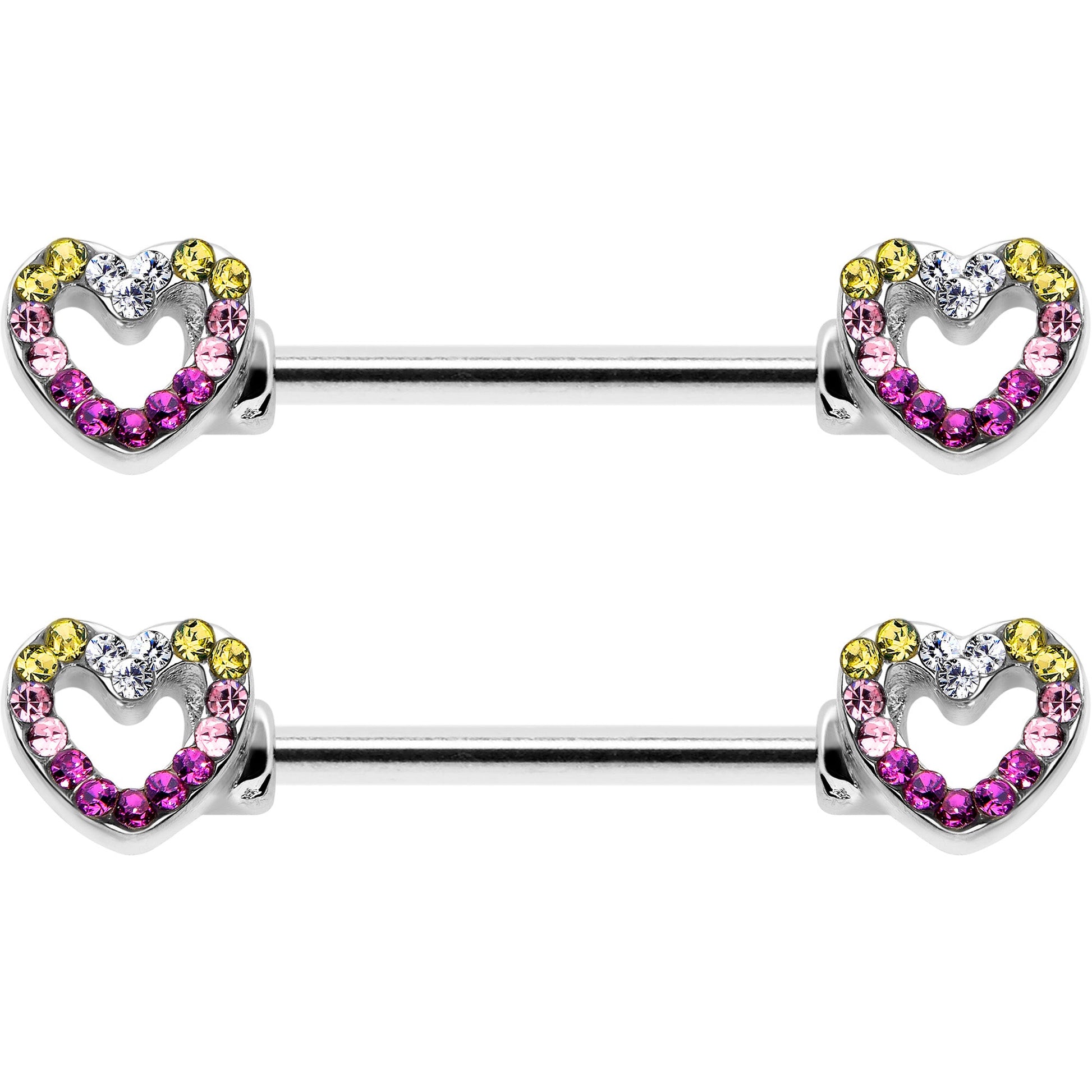 Love comes in all kinds of colors so keep your heart open and the world will notice - like on this 14 gauge nipple jewelry. It's made with 14mm durable 316L surgical grade stainless steel straight barbells. Each of the ends features a hollow heart charm, with the hearts paved with color gems. The hearts are open at the centers for an airy look. For the incurable romantic, these colorful valentine's nipple piercing rings are sure to make you fall in love. Sold as a set of two.Specifications