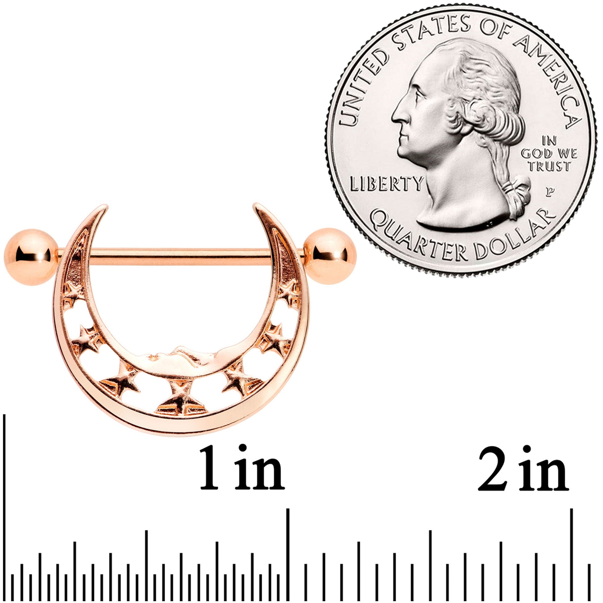 The man in the moon has come down from the sky to help ornament your nipple piercings! These 14 gauge nipple rings are made with 14mm rose gold tone plated over 316L surgical grade stainless steel straight barbells with 5mm ball ends. Hanging from the barbell is a crescent moon, open in the middle with small stars filling its length. In the center of the curve is the moon's face, with minimalist detailing for an elegant and timeless look. These would be absolutely perfect for vertical nipple piercings but will look gorgeous in horizontal ones as well. Sold as a set of two.Specifications