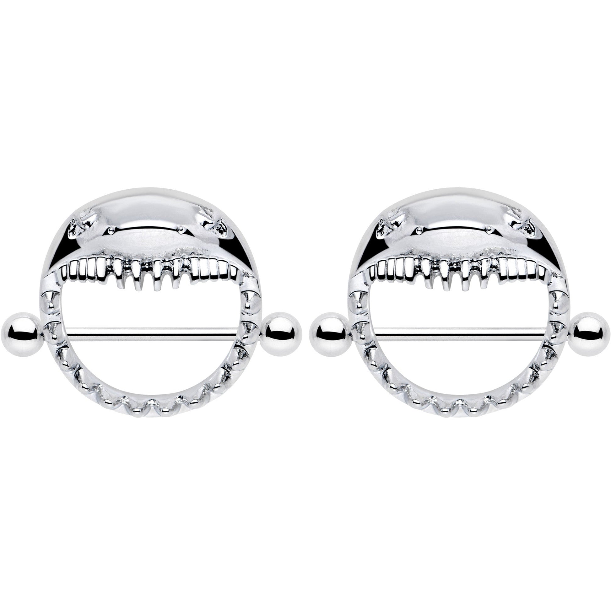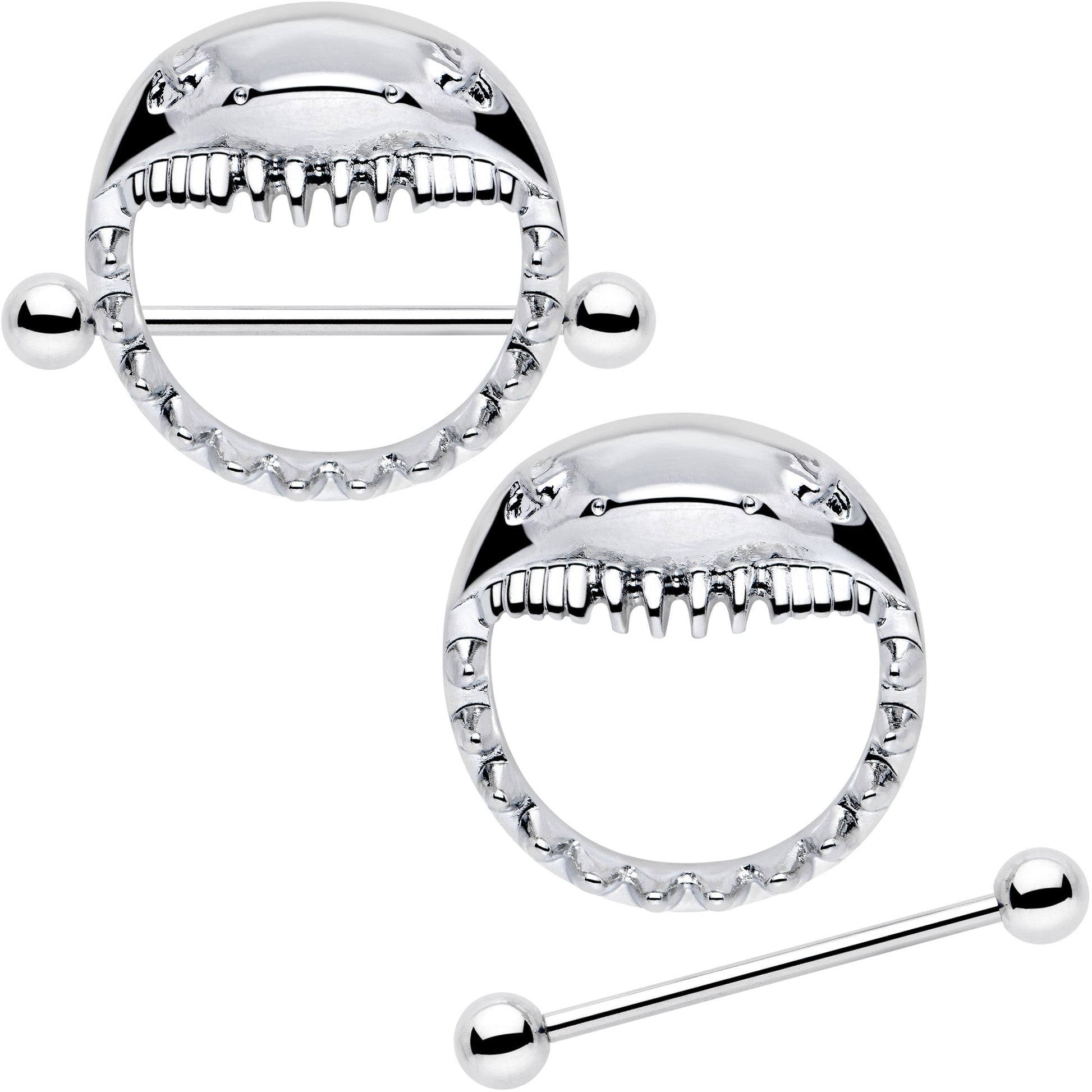 You're gonna need a bigger jewelry box....to add this 14 gauge nipple jewelry to your collection. It's made with 14mm durable 316L surgical grade stainless steel straight barbells with 5mm ball ends. The shield portions features shark heads, with their open mouths embellished with terrifying teeth detailing. Whether you're on dry land or the open water, the jaws on these shark nipple piercing rings are sure to turn heads. Sold as a set of two.Specifications