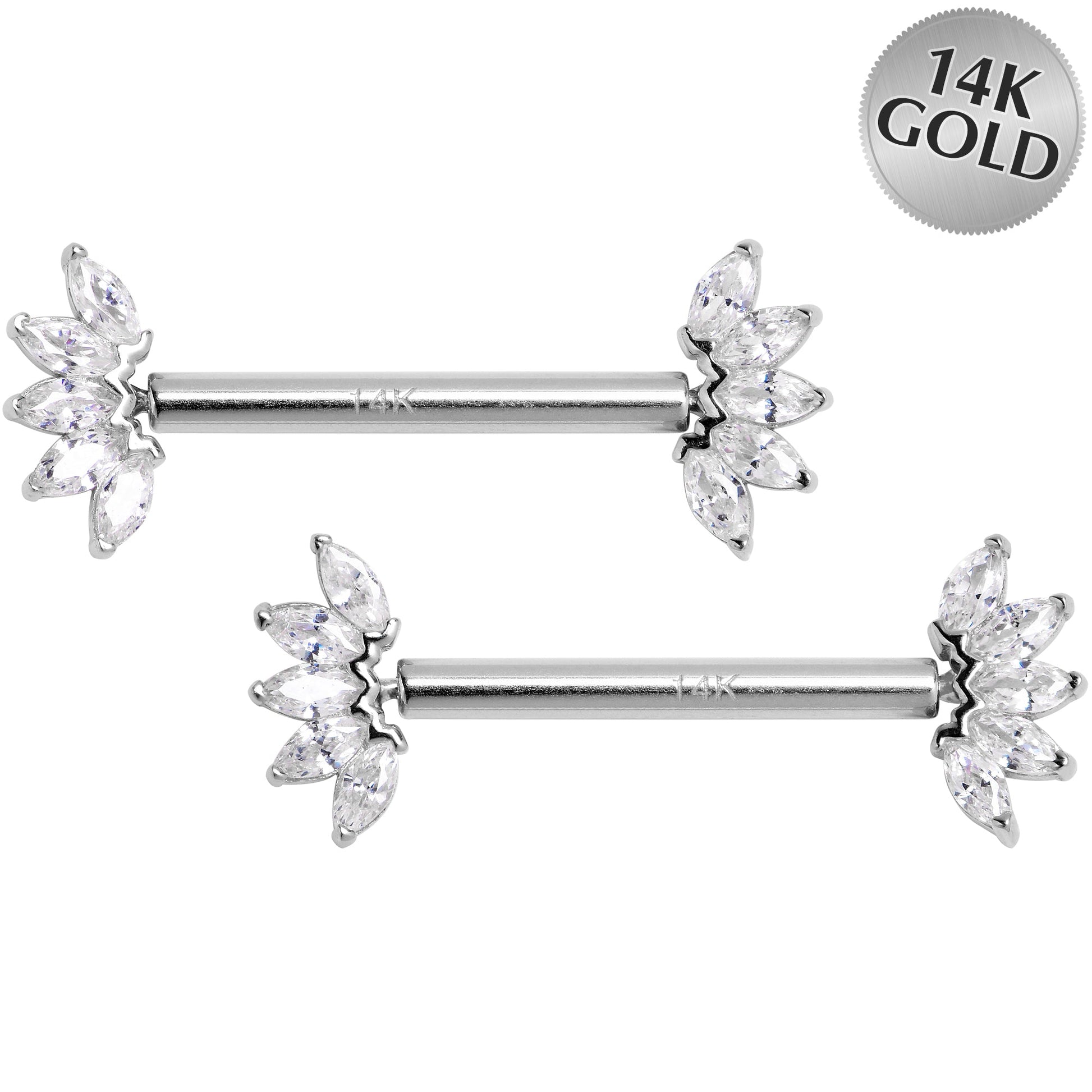 Get fashion forward with these 14 gauge 14k solid gold barbell nipple rings! The ends are set with cubic zirconia gems in a floral design, facing forward for a look that's very distinct and eye-catching. If that weren't enough, they also feature a threadless design that makes insertion and removal super easy! Give your nipple piercings some forward-facing dazlle with this fashionable solid gold threadless nipple jewelry! Sold as a set of two.Specifications