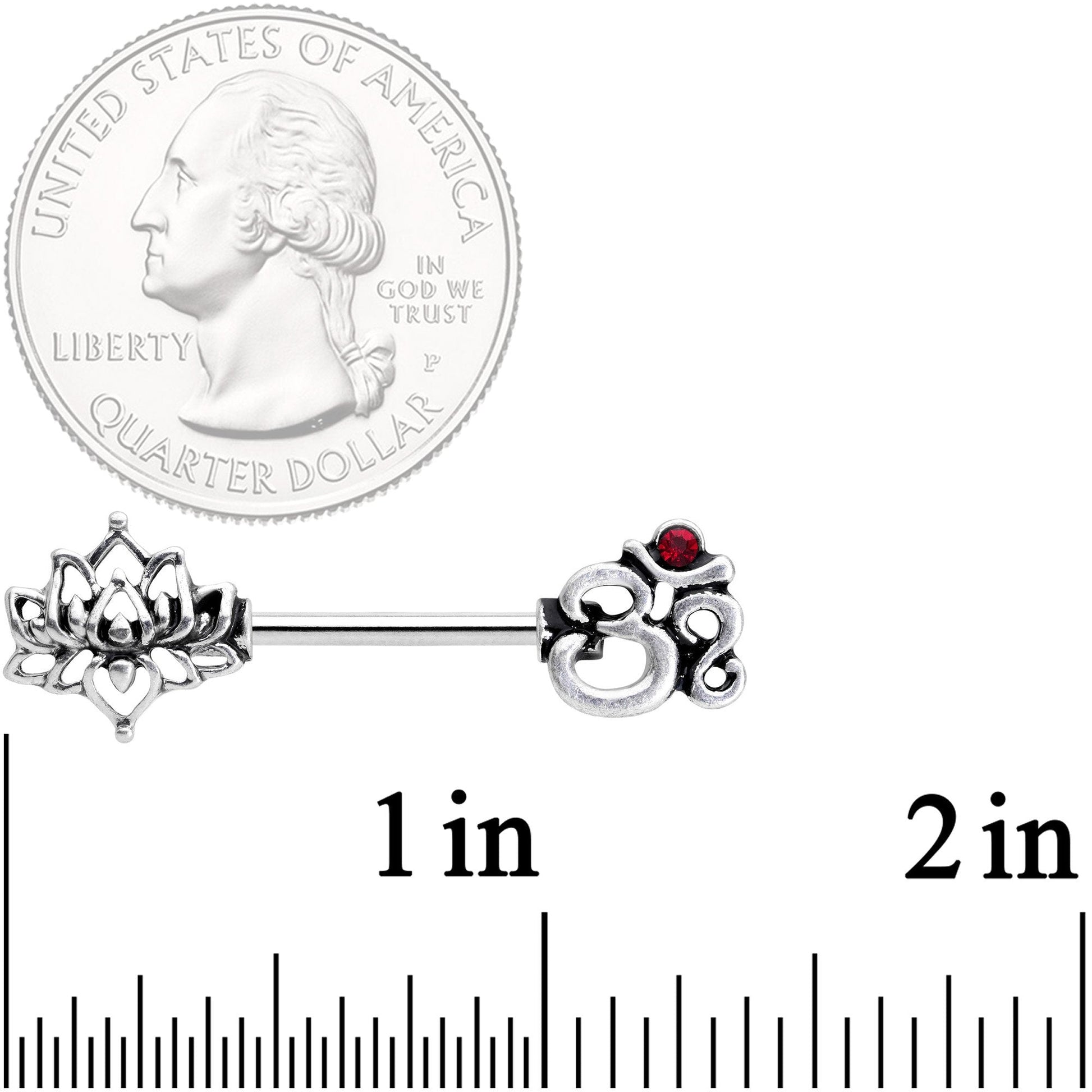 If you want your breasts to reflect your spiritual best then look no further than this pair of 14 gauge nipple piercings with zen style. Made with 14mm durable 316L surgical grade stainless steel straight barbells, these nipple piercings feature one end with an Om symbol charm and the other end with a lotus flower charm end. Sold as a set of two.Specifications