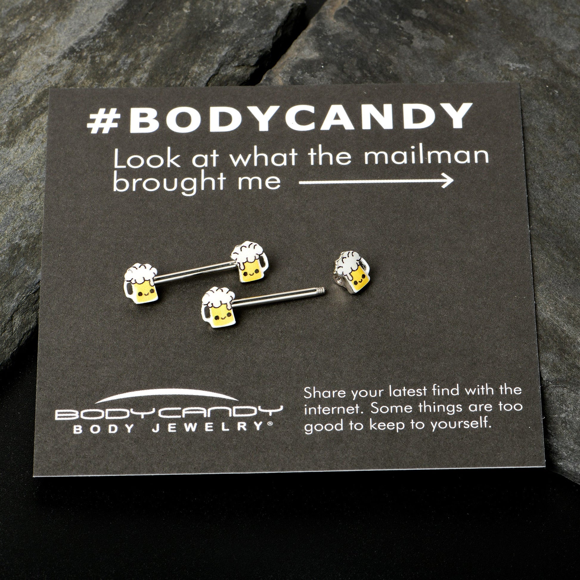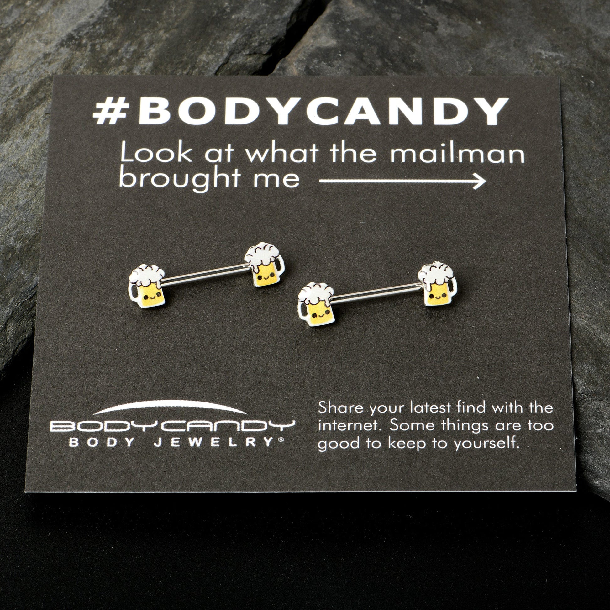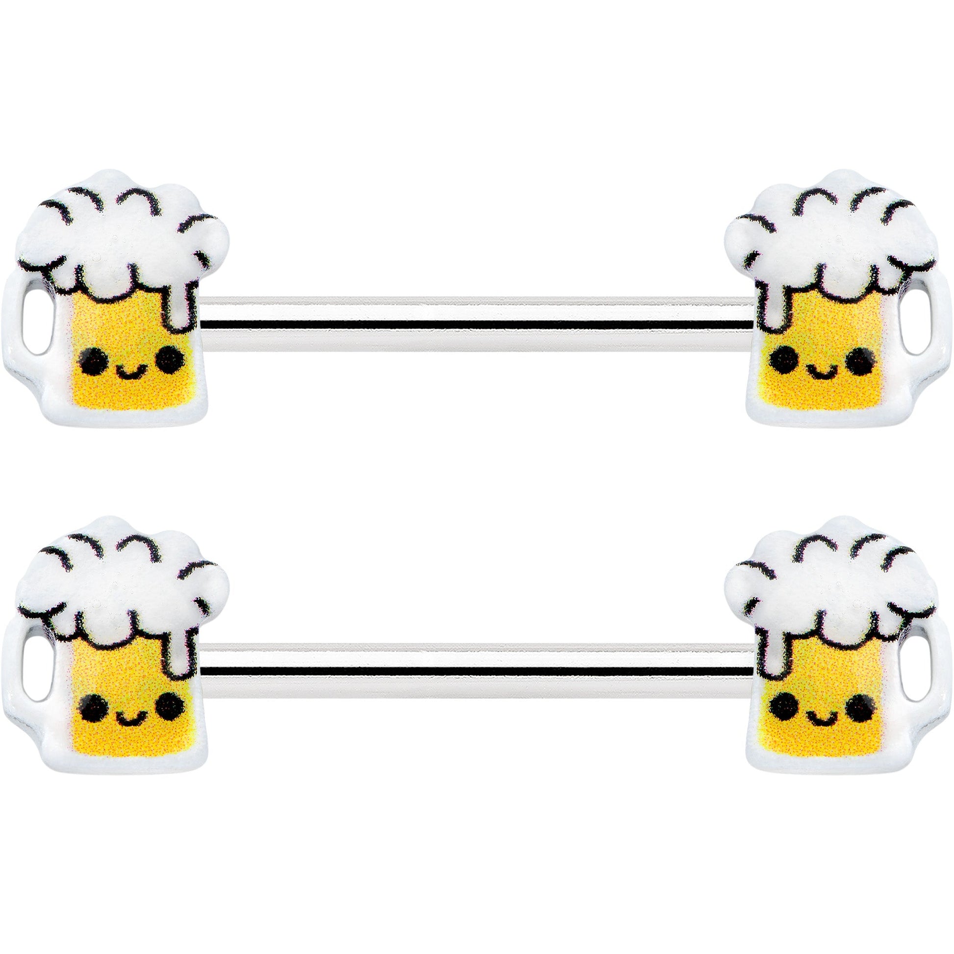 This St Patrick's Day, belly up to the bar with this 14 gauge nipple jewelry! It's made with 14mm durable 316L surgical grade stainless steel straight barbells. Each of the ends features a mug of beer charm, with a happy little face on each one. If you're looking to celebrate this St. Patrick's Day with a beer, have no fear - we've got two beers for your nipple piercings with this festive nipple piercing jewelry! Sold as a set of two.Specifications