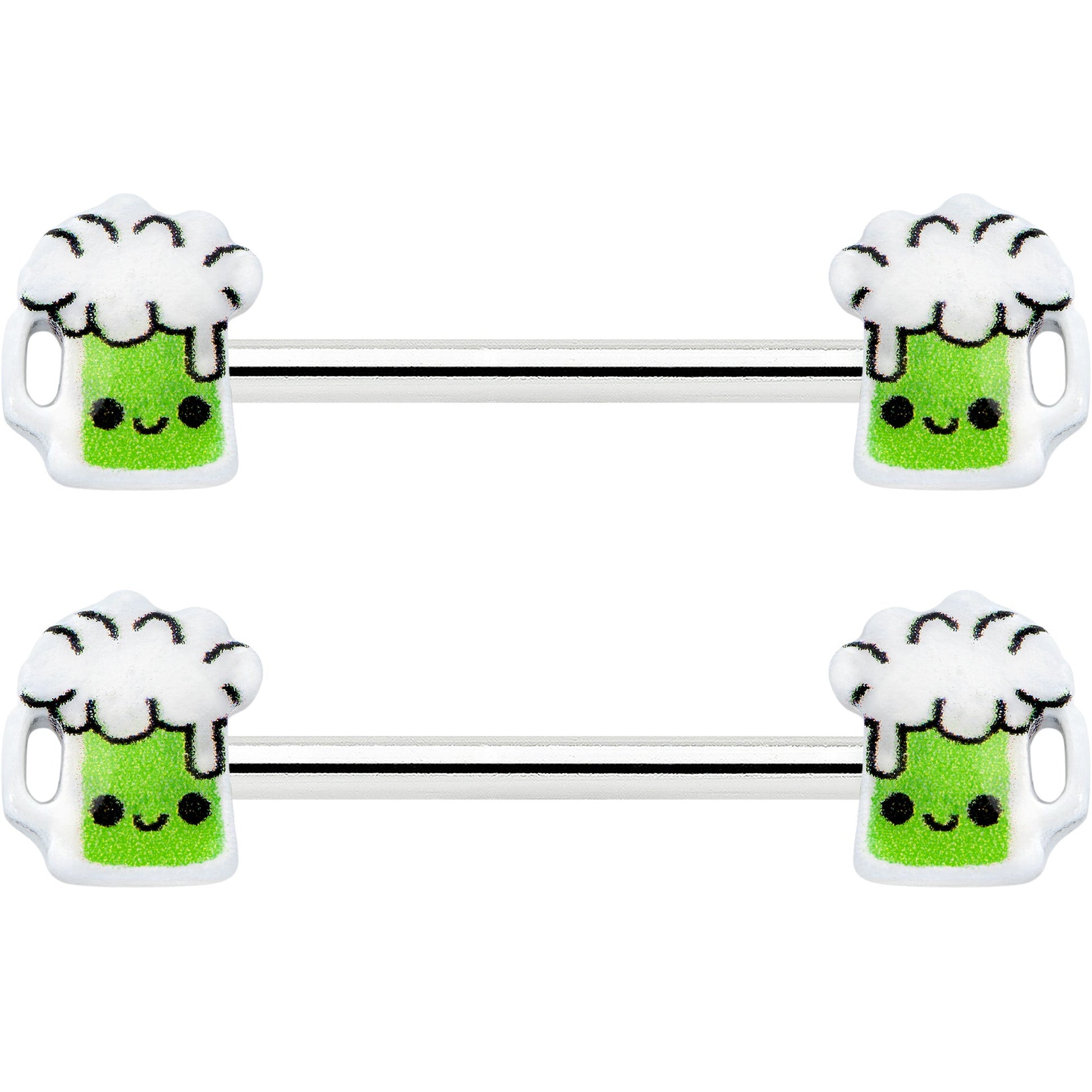 This St Patrick's Day, belly up to the bar with this 14 gauge nipple jewelry! It's made with 14mm durable 316L surgical grade stainless steel straight barbells. Each of the ends features a green beer charm, with a happy little face on each one. If you're looking for a bit of green to wear this St. Patrick's Day, have no fear - we've got some beer for your nipple piercings with this festive nipple piercing jewelry! Sold as a set of two.Specifications