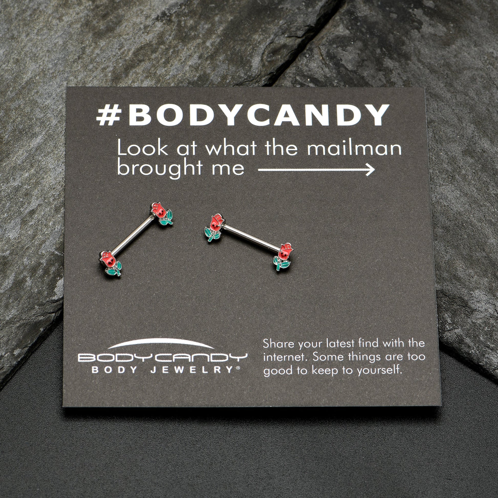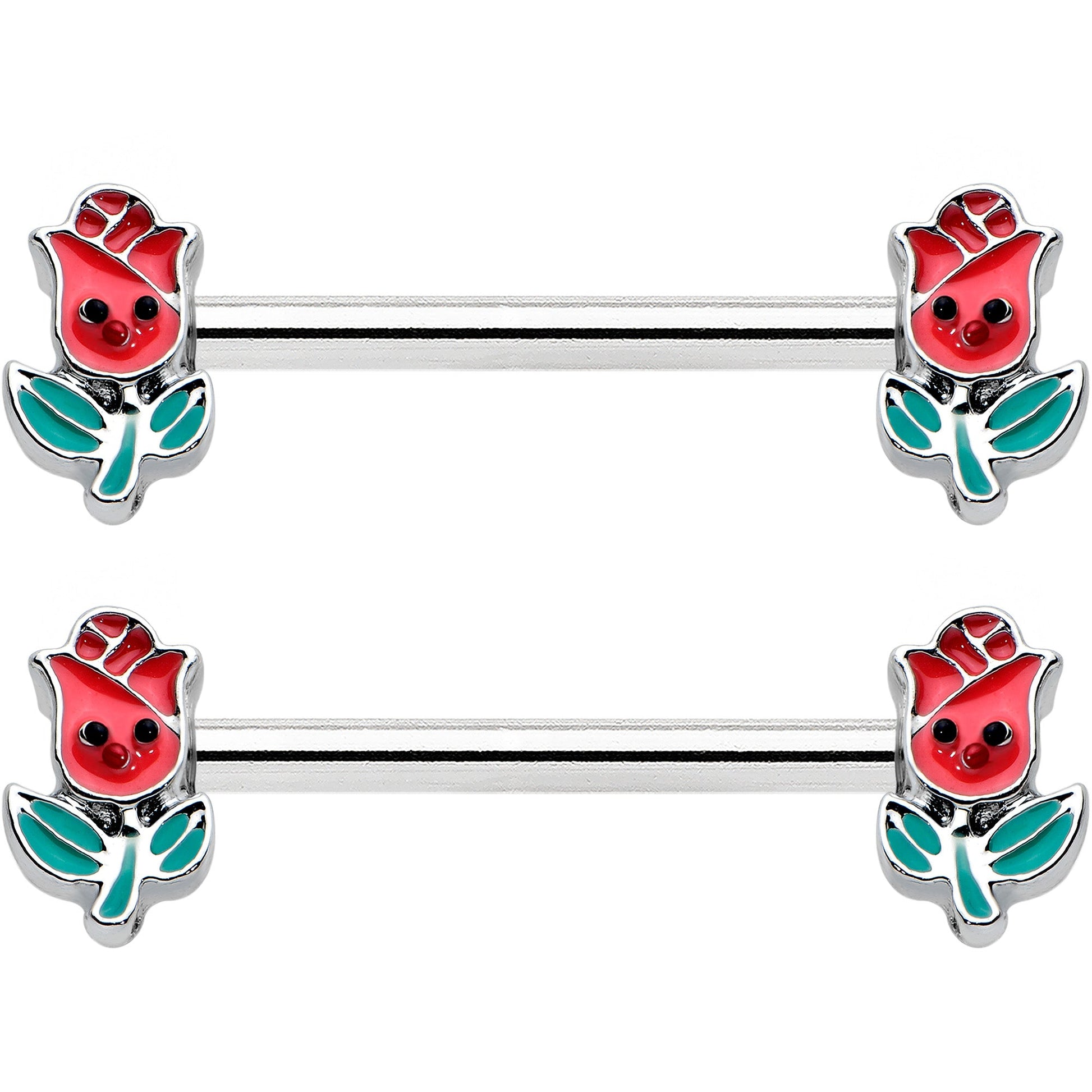 The roses on this 14 gauge nipple jewelry look delighted to be adorning your piercings! It's made with 14mm durable 316L surgical grade stainless steel straight barbells. Each of the ends features a rose flower charm, with a red inlaid blossoms and green inlaid leaves and stems. They also feature cheerful faces on the blossom portions, for a truly winsome touch. Rise to every occasion with with these endearing floral nipple piercing rings! Sold as a set of two.Specifications