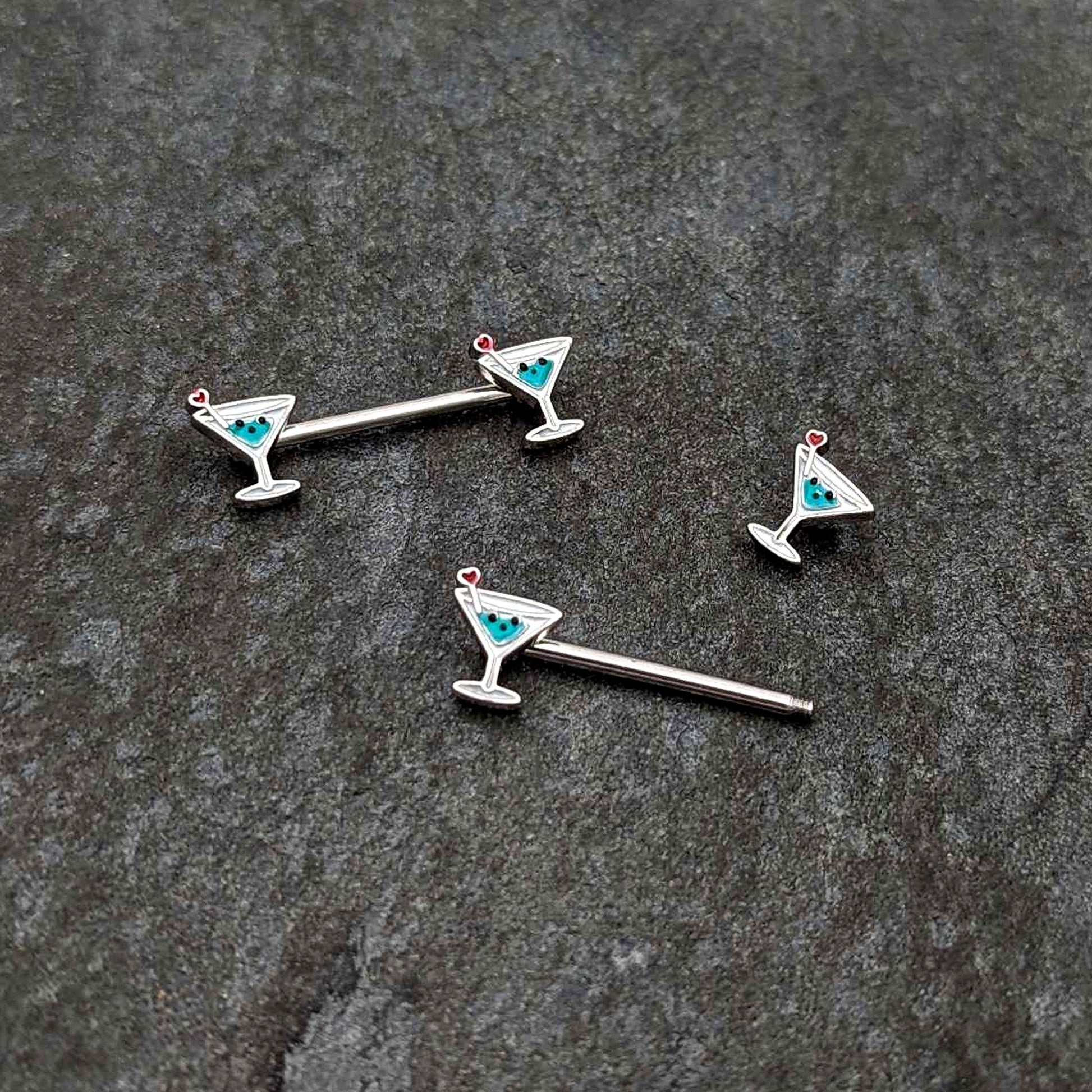 Bottoms up for style, with this 14 gauge nipple jewelry! It's made with 14mm durable 316L surgical grade stainless steel straight barbells. Each of the ends features a martini glass charm, with blue embellishment and a heart-ended swizzle stick. They also features faces on the glasses for added sweet style. Drink in the compliments when you're rocking these cocktail-themed nipple piercing rings! Sold as a set of two.Specifications