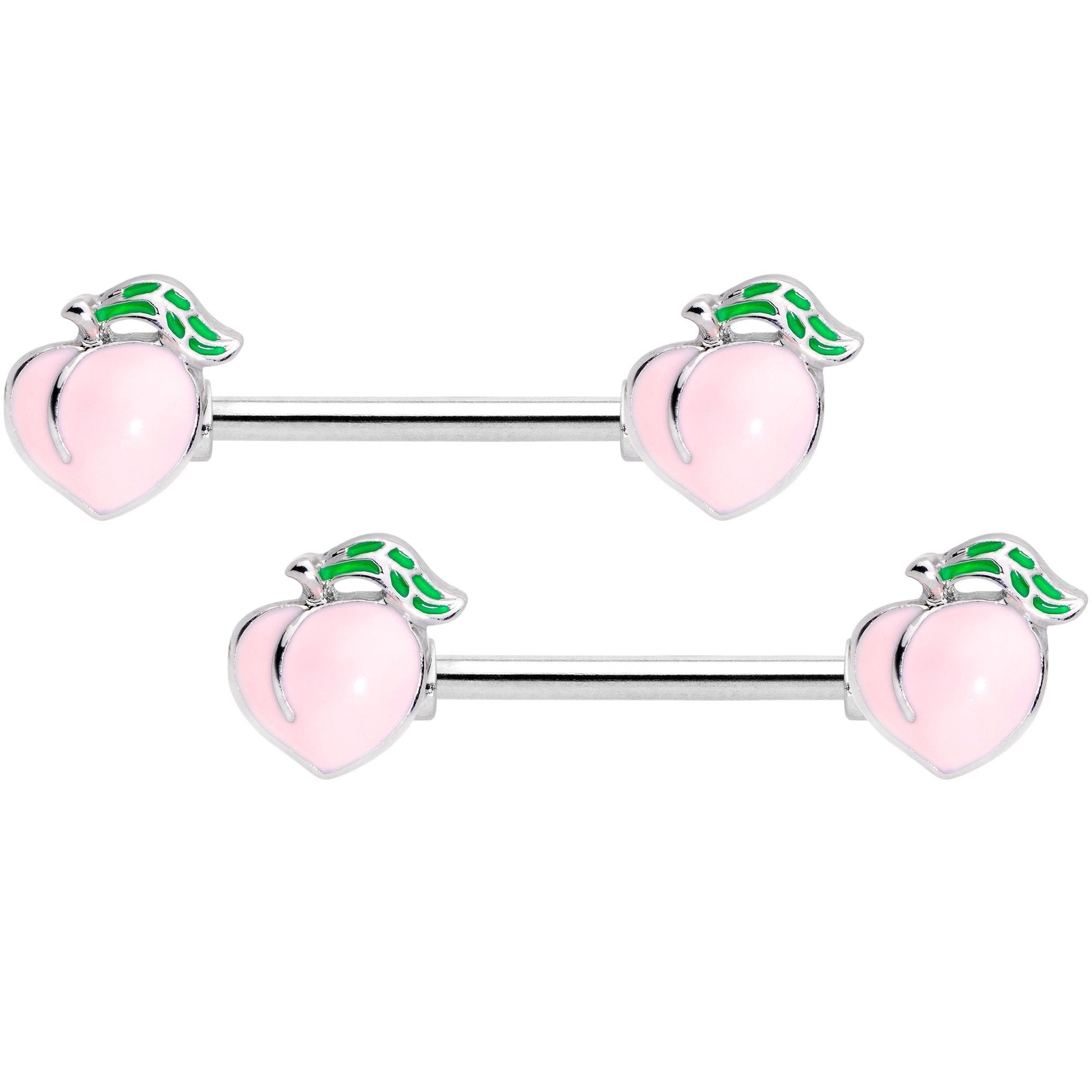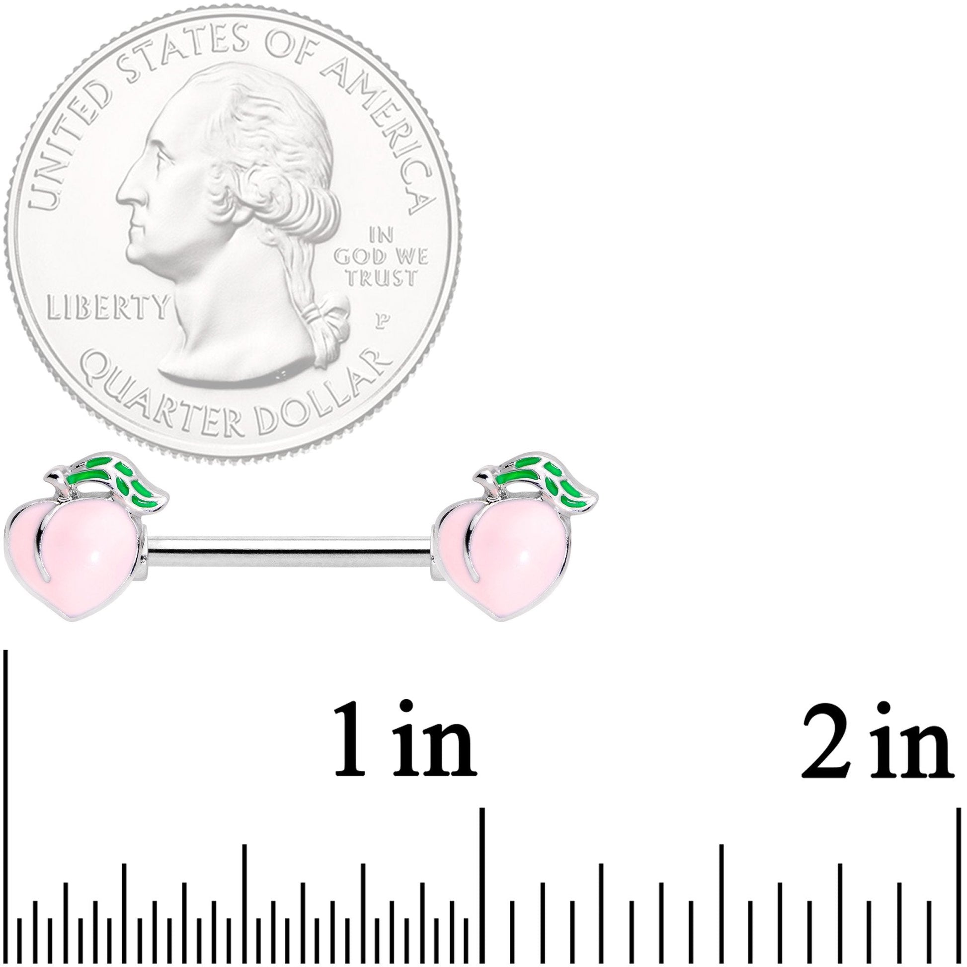 Mmmmm.......so sweet and juicy! These 14 gauge nipple piercings are ripe and ready to be plucked from the tree. They're made with 14mm durable 316L surgical grade stainless steel straight barbells. The ends each feature a pink peach with green in the leaves and crack details that make the whole thing feel extra realistic. If you have a fondness for the flesh of the fresh fuzzy fruit, these nipple barbells are bound to get your juices flowing! Sold as a set of two.Specifications