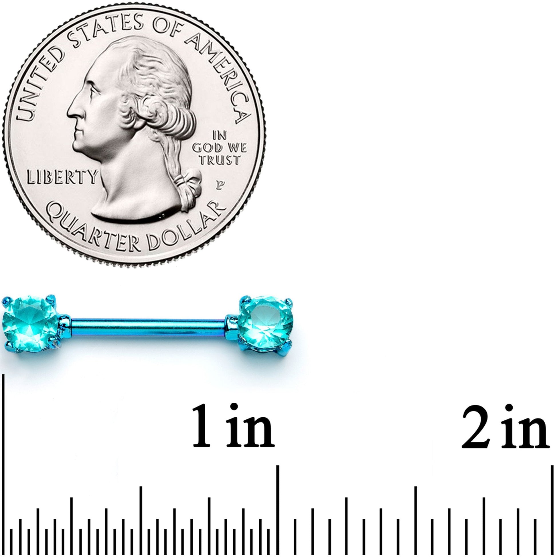 Don't be bashful about how you feel about teal with these 14 gauge nipple rings! Featuring blue-green gem ends, they'll make sure nobody can mistake your favorite color. They are 14mm and made of blue anodized over durable 316L surgical grade stainless steel straight barbells. Feel the appeal of teal! Sold as a pair.Specifications