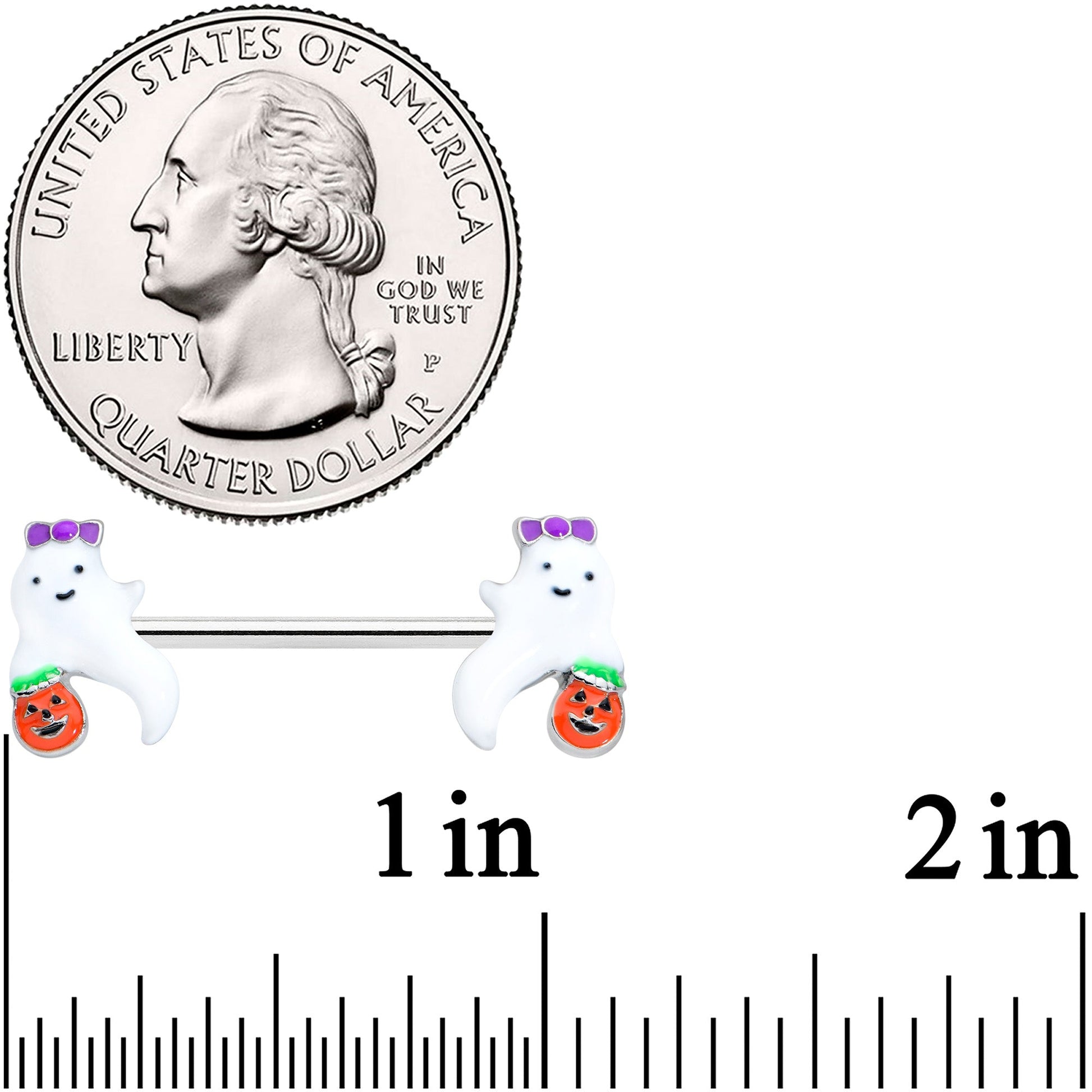 Someone's all dressed up and ready for Halloween on this 14 gauge nipple jewelry! It's made with 14mm durable 316L surgical grade stainless steel straight barbells. Each of the ends features a ghost charm with a purple bow and pumpkin for trick or treating too! Get a look that's absolutely haunting and sweeter than Halloween candy with this trick or treating ghost nipple piercing jewelry! Sold as a set of two.Specifications
