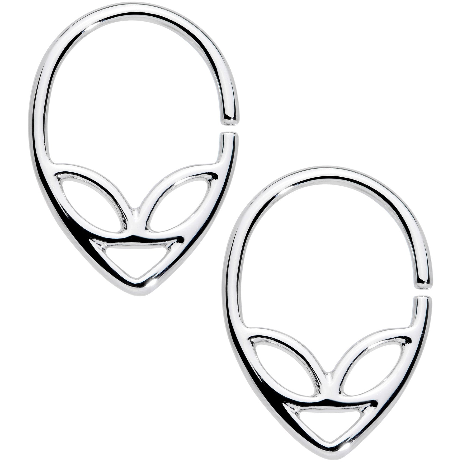 Finish your look with something stellar when you wear these 14 gauge alien nipple rings. Made with rhodium plated over brass, each one is made in the shape of an alien's face and they are super easy to insert and remove. Just give them a light twist, insert them into your piercing and gently bend them closed. This nipple jewelry is absolutely out of this world because it can be worn in piercings like your nipples, septum, some stretched lobes, and helix piercings too! Sold as a set of two.Specifications