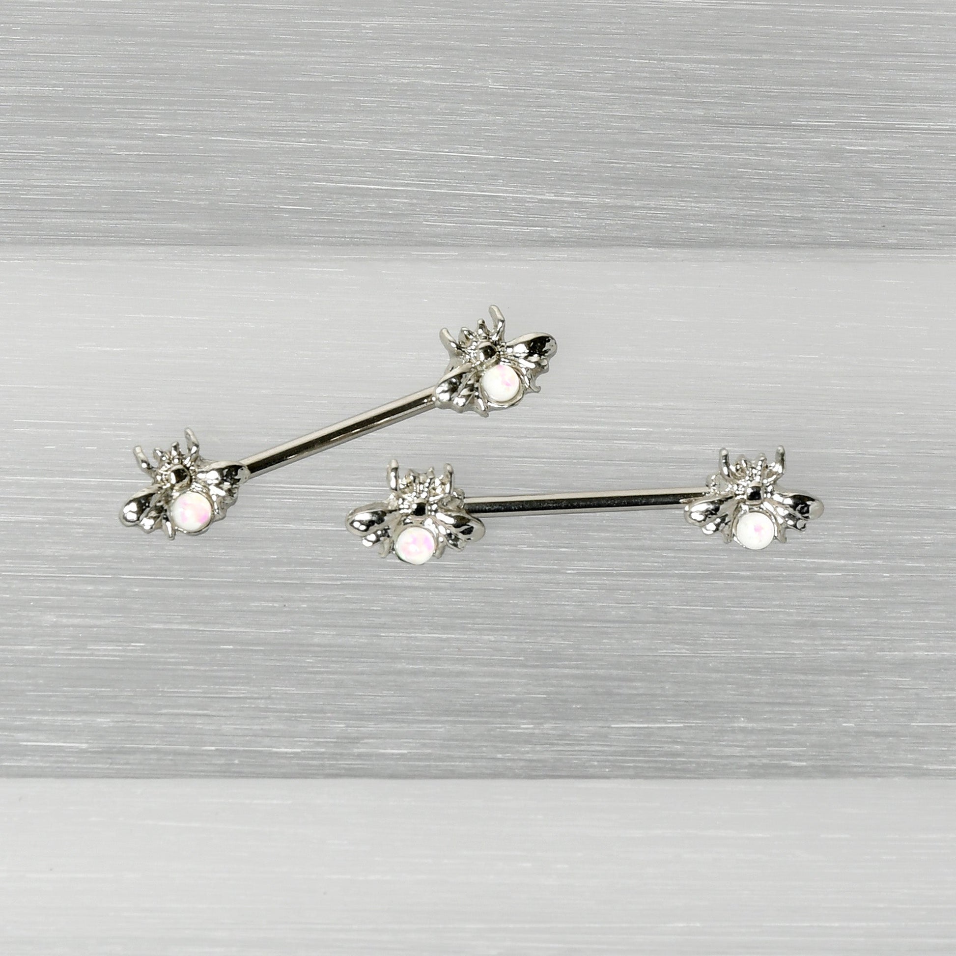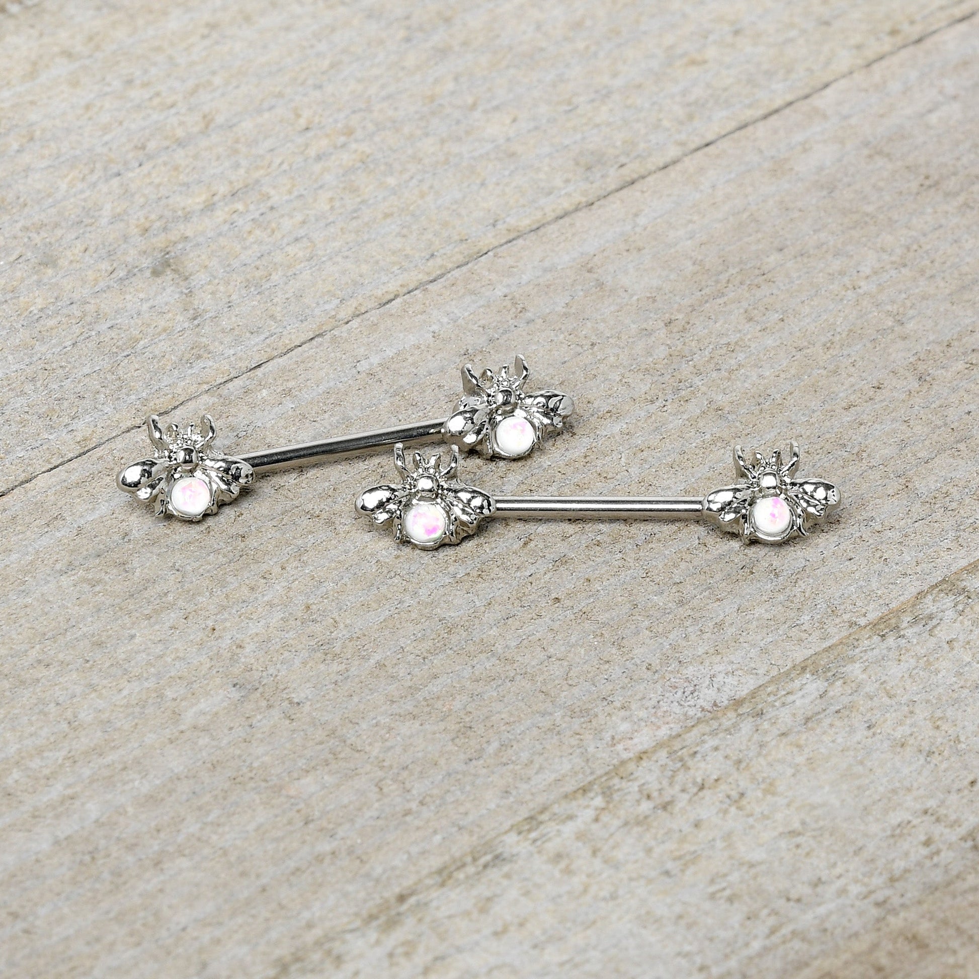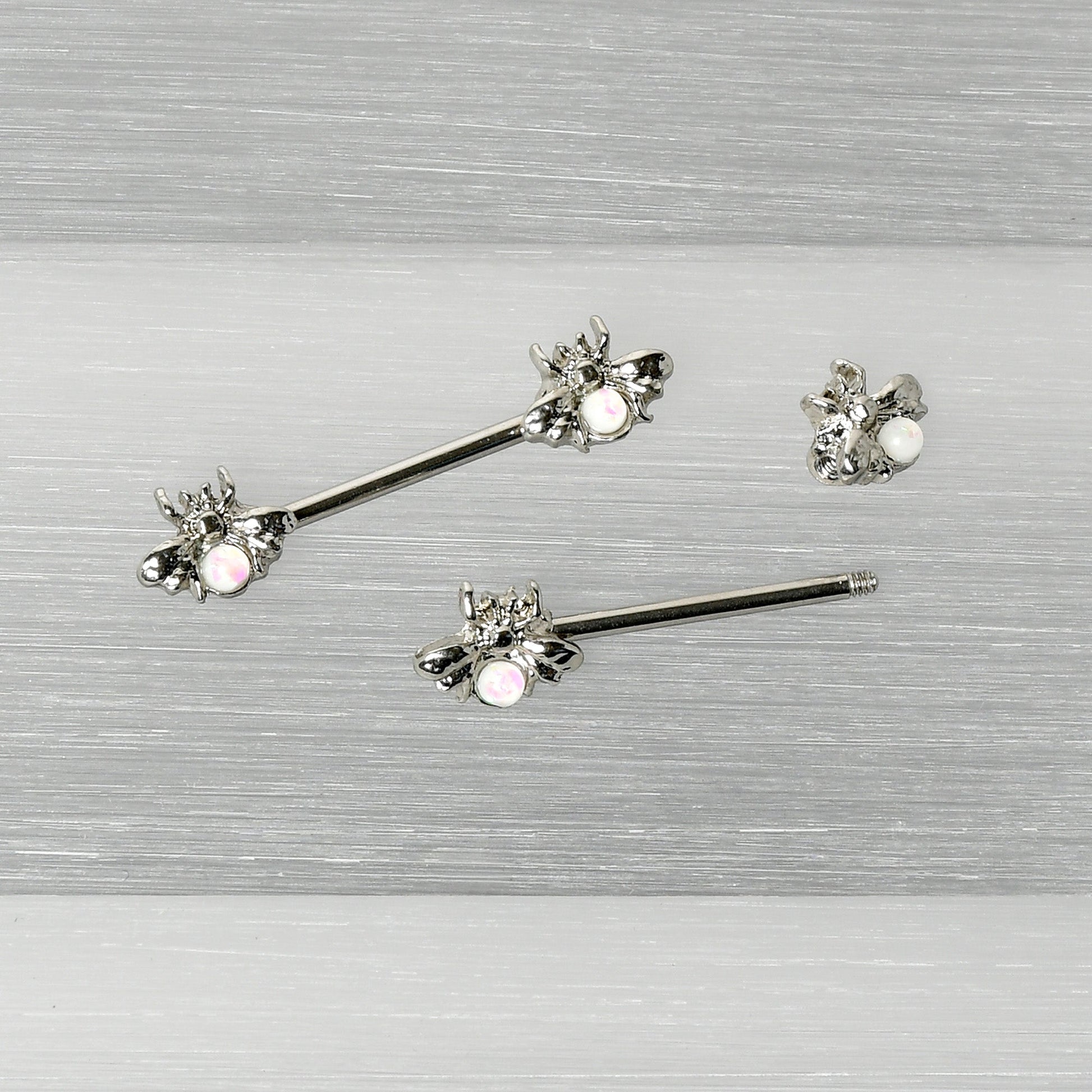 14G 9/16 White Faux Opal Bee Beauty Insect Barbell Nipple Ring Set