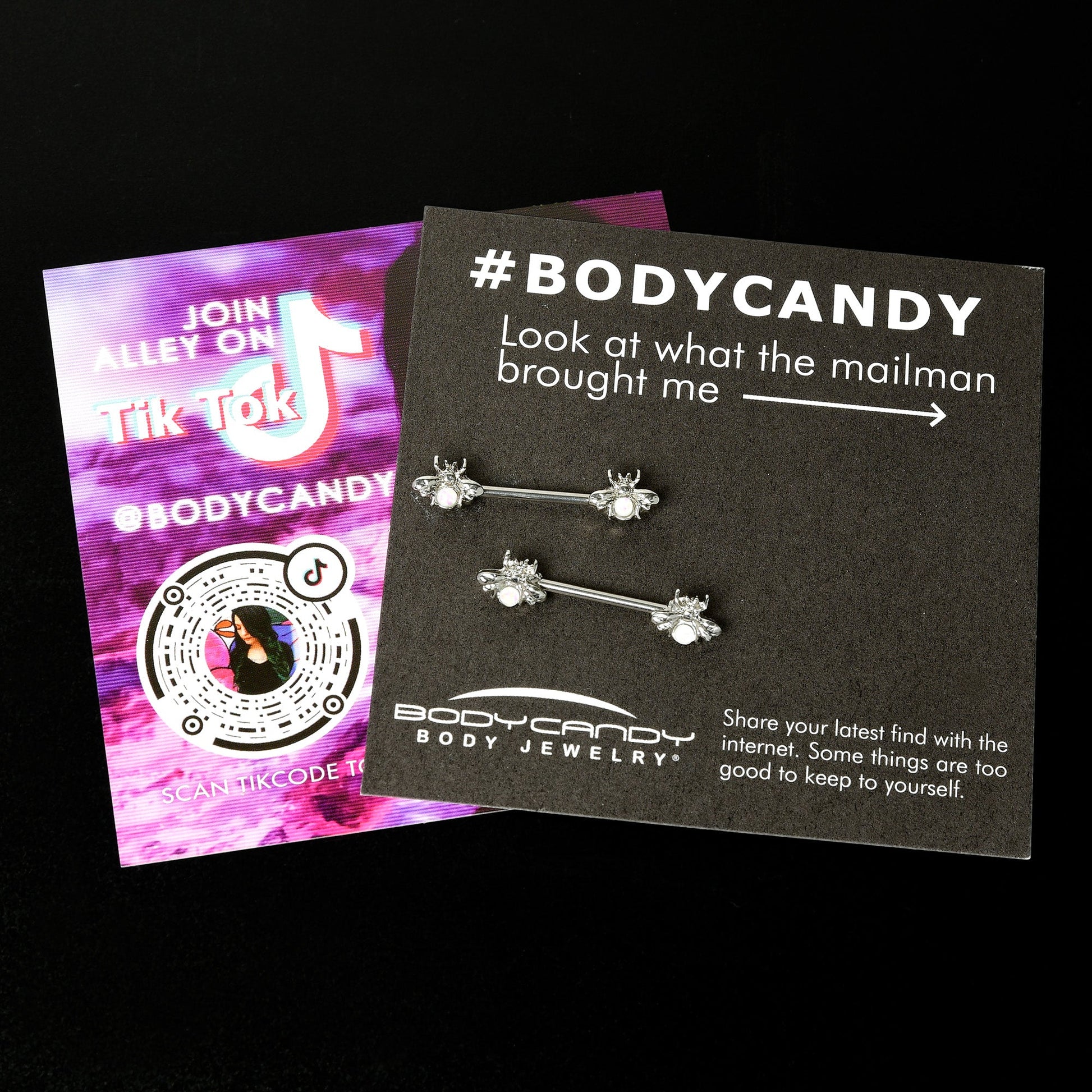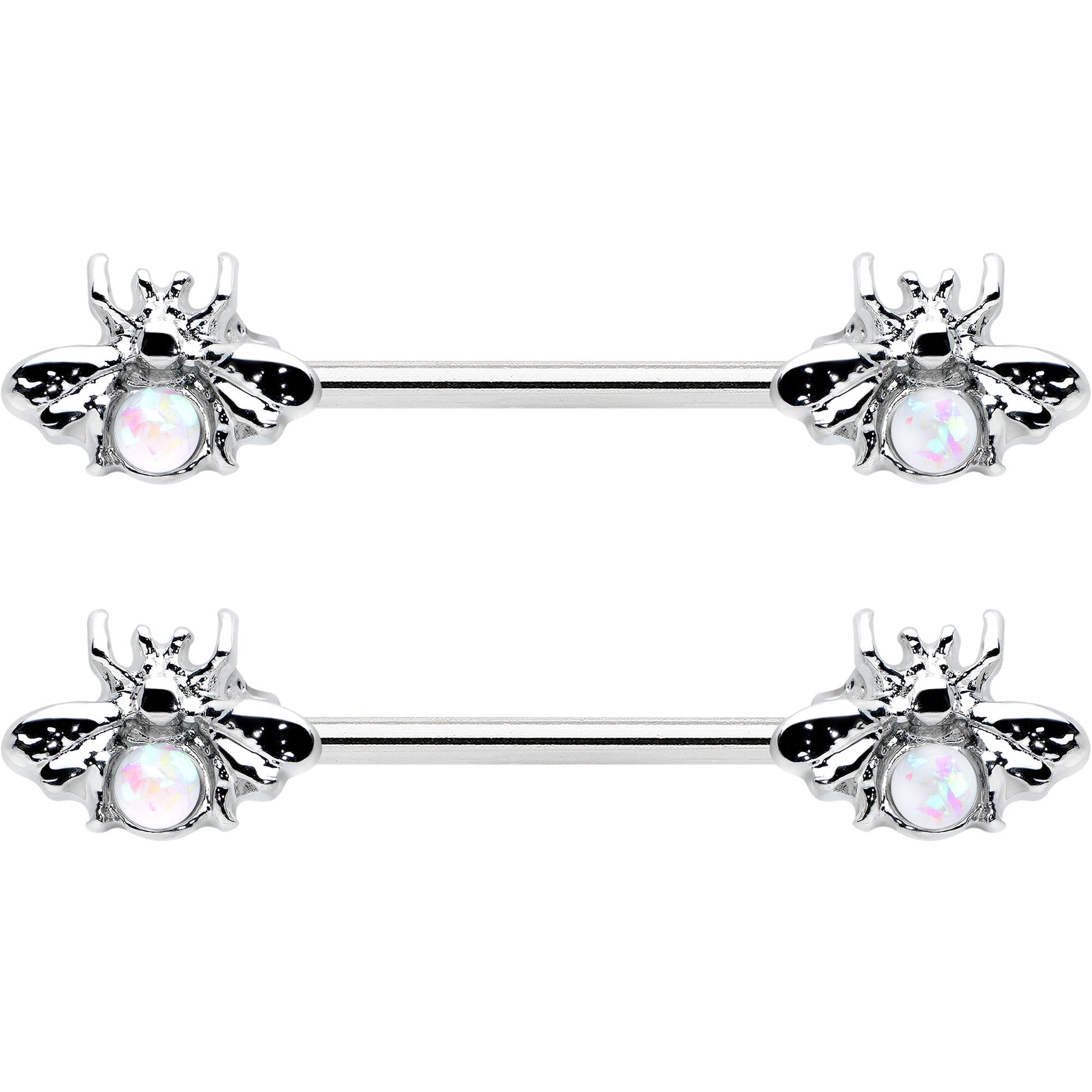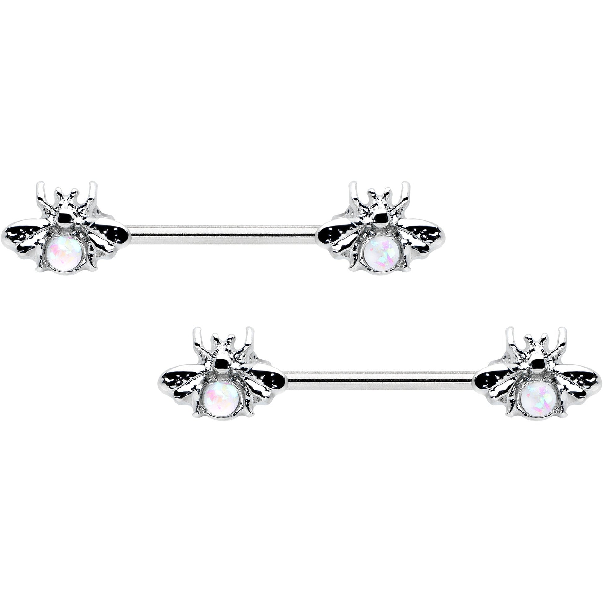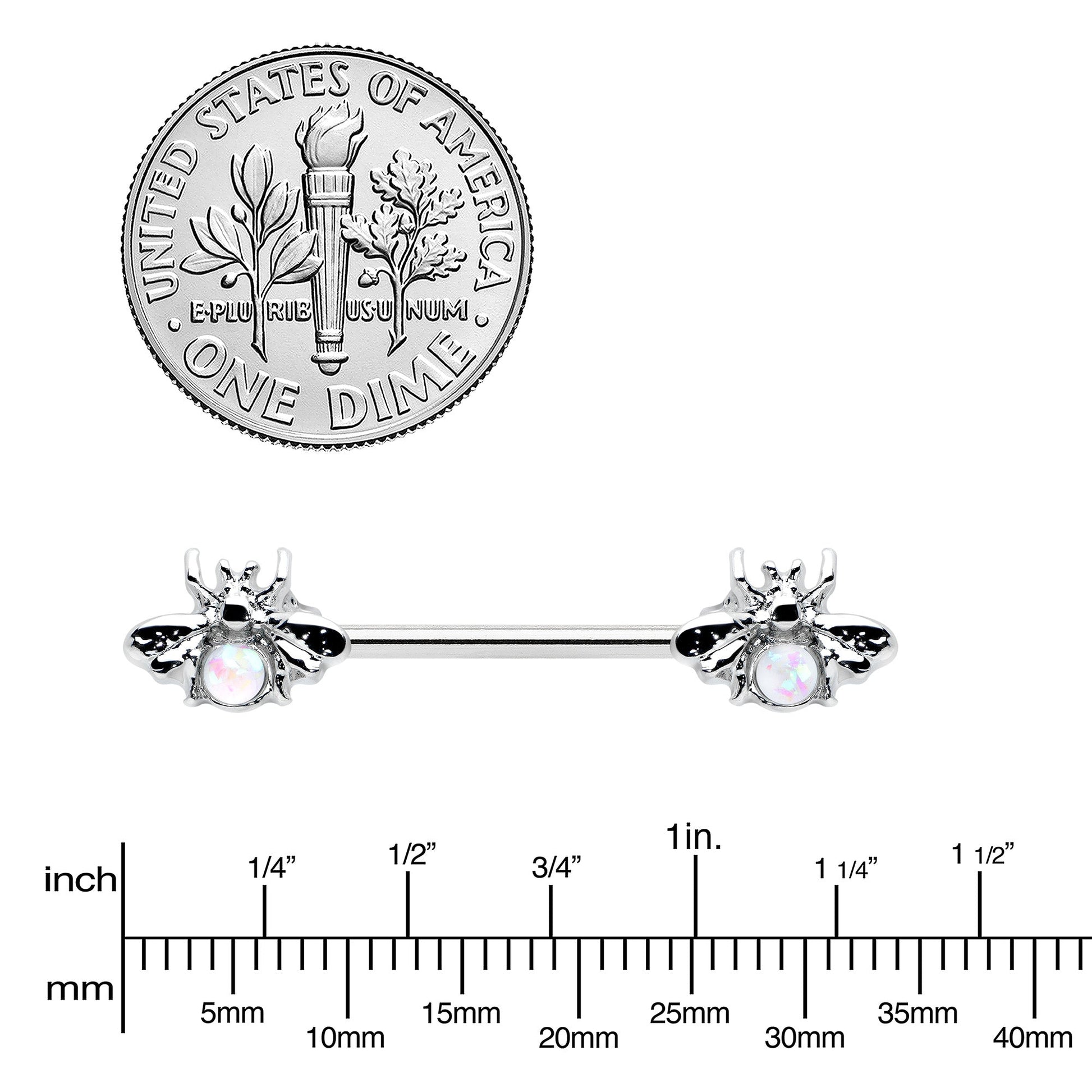 14G 9/16 White Faux Opal Bee Beauty Insect Barbell Nipple Ring Set