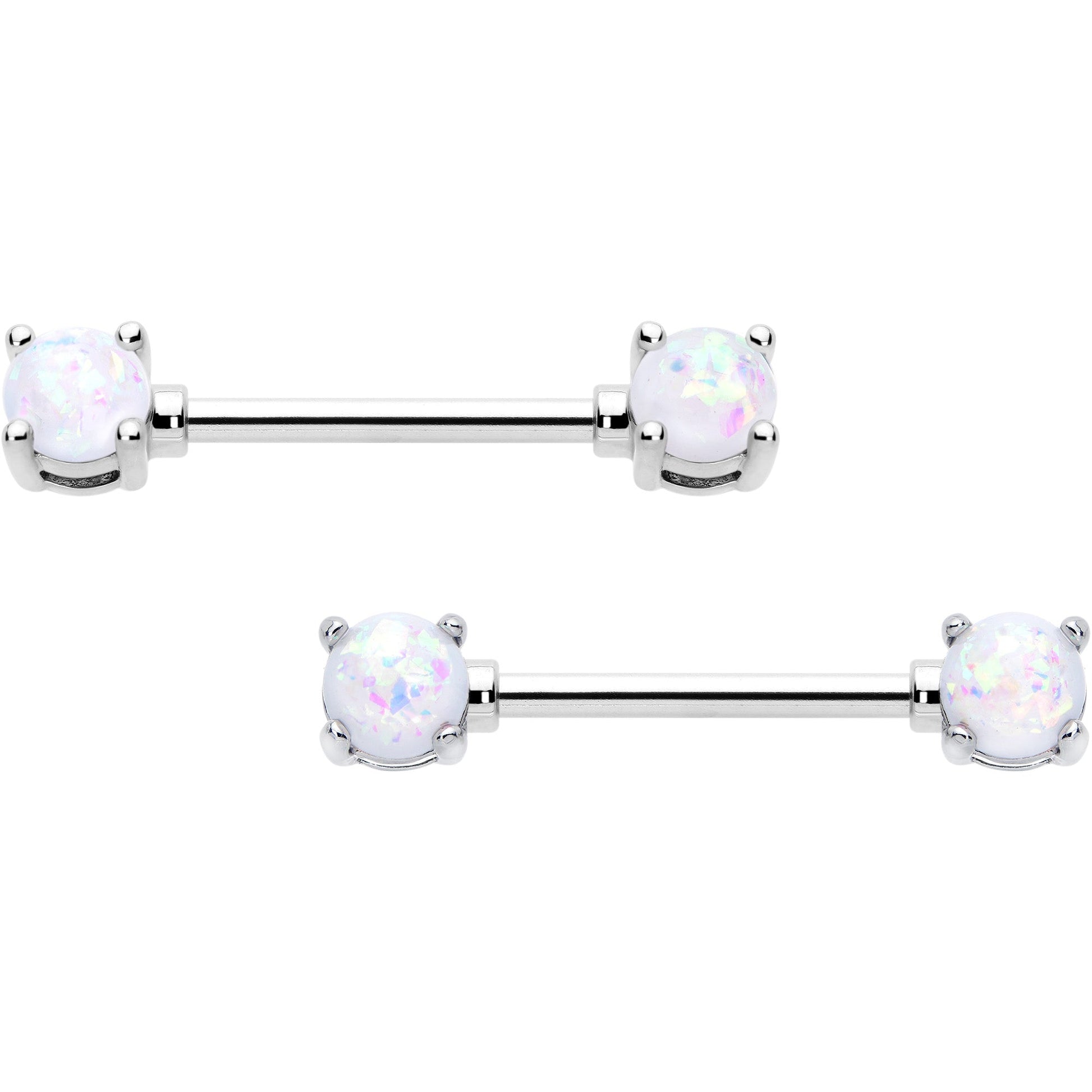 Party like it's your birthday all year long when you are rocking this 14 gauge nipple jewelry. It is made with 14mm durable 316L surgical grade stainless steel straight barbells. Each of the ends features forward facing white faux opals that emulate the birthstone for the month of October. Get festive and fabulous all year long with these charming nipple piercing rings. Sold as a set of two.Specifications