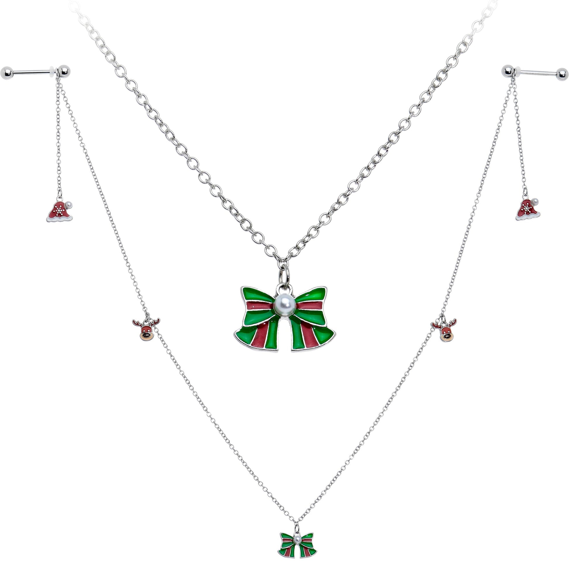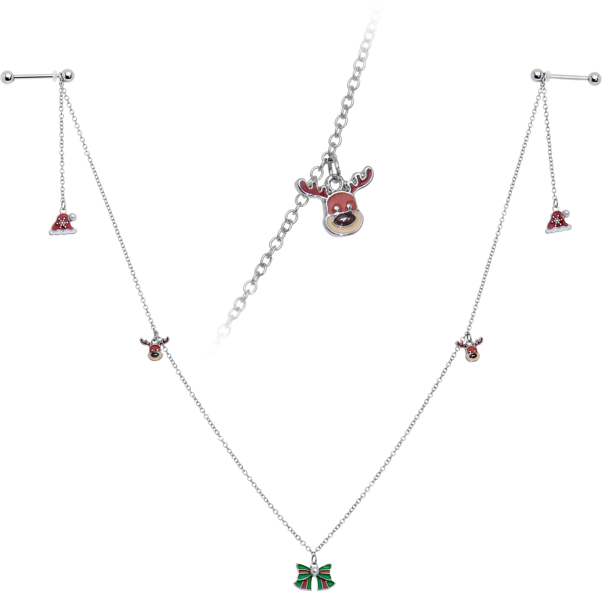 Bedeck your body with holiday cheer when you're rocking this 14 gauge nipple jewelry! It's made with 14mm durable 316L surgical grade stainless steel straight barbells with 5mm ball ends. Each barbell features a 2" length of chain with a Santa hat charm at the end. The hats are red and embellished with white pearlescent orbs. The barbells are then connected by two 7" chains, each featuring a dangling reindeer head with a sweetly oversized black nose. The longer chains are connected by a red and green bow charm, embellished with another white pearlescent orb for a cohesive appearance. You can't help but feel as festive as you look in this holiday themed nipple piercing jewelry.Specifications