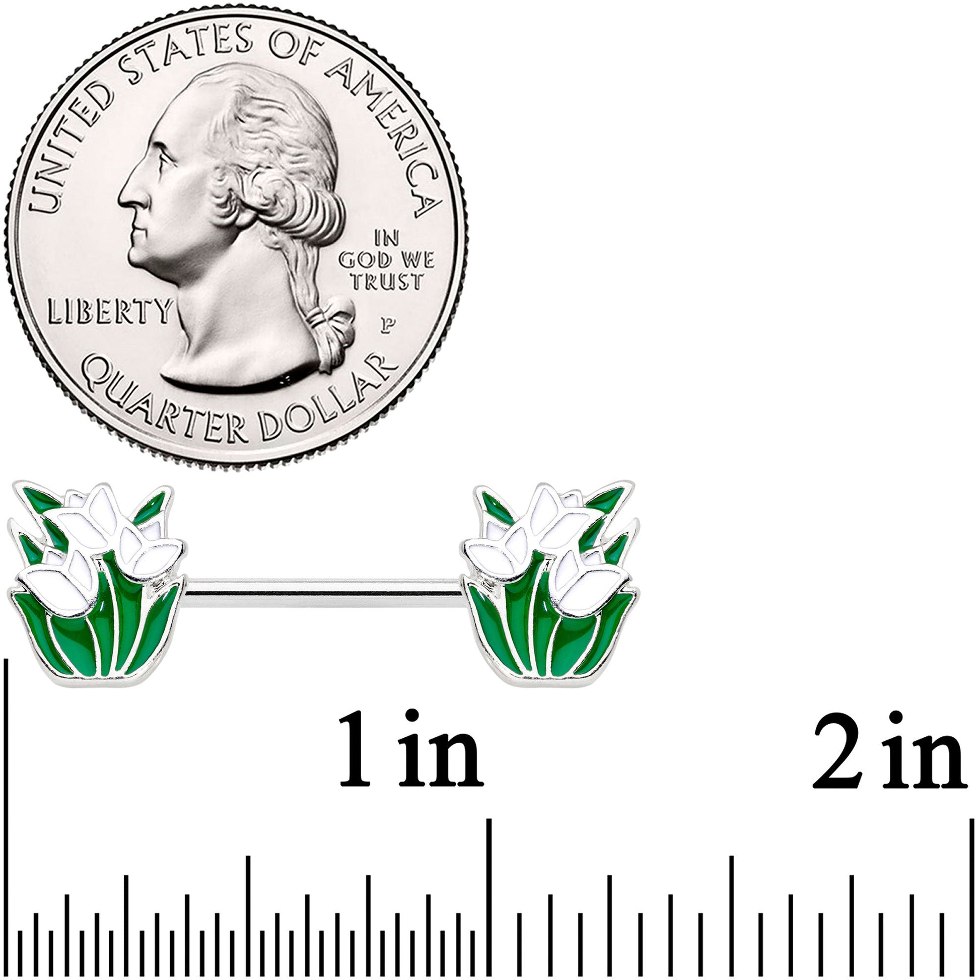 Treat yourself to some Springtime tulips with this 14 gauge nipple jewelry! It's made with 14mm durable 316L surgical grade stainless steel straight barbells. Each of the ends features a flower charm of tulips, with the leaves and stems inlaid in deep green and the blossoms inlaid in white. Score a sexy and stylish Spring look with these gorgeous floral nipple piercing rings! Sold as a set of two.Specifications