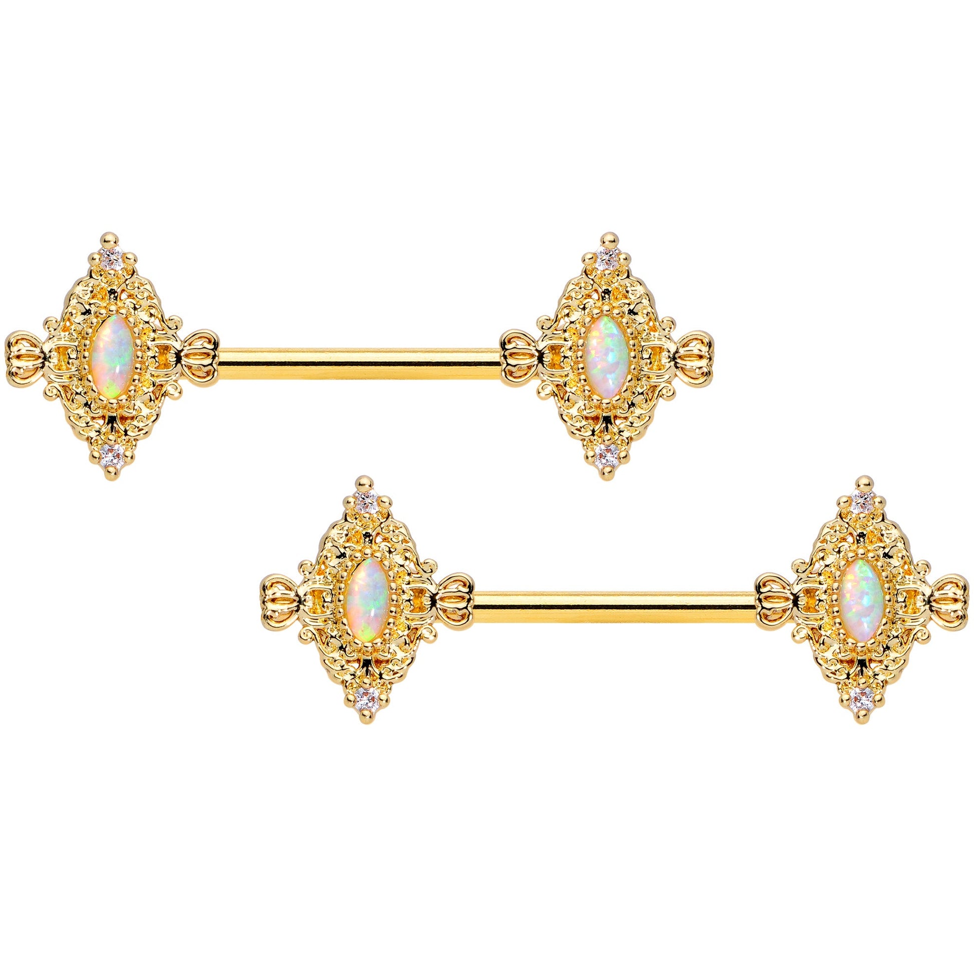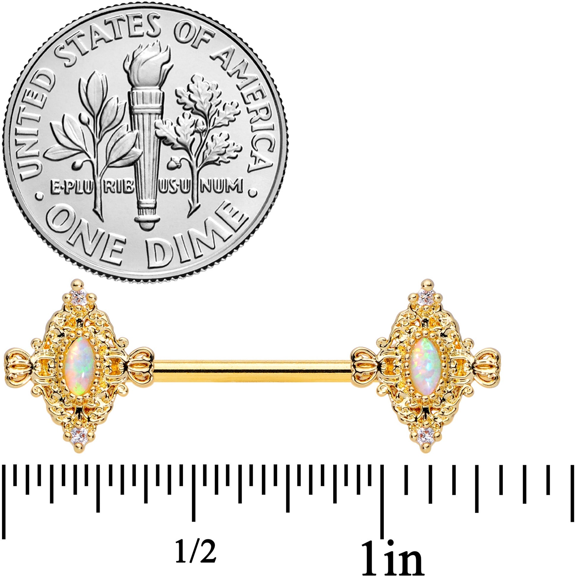 14G 9/16 White Synthetic Opal Gold Tone Barbell Nipple Ring Set