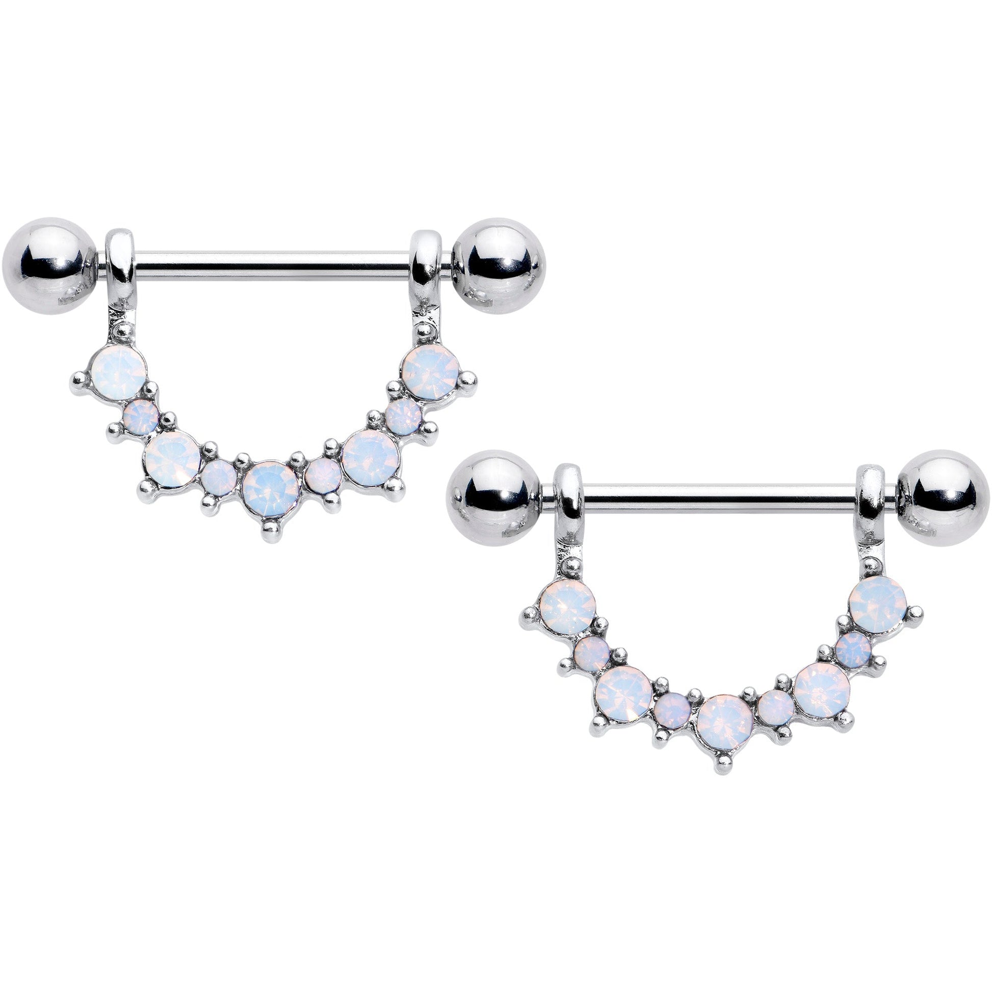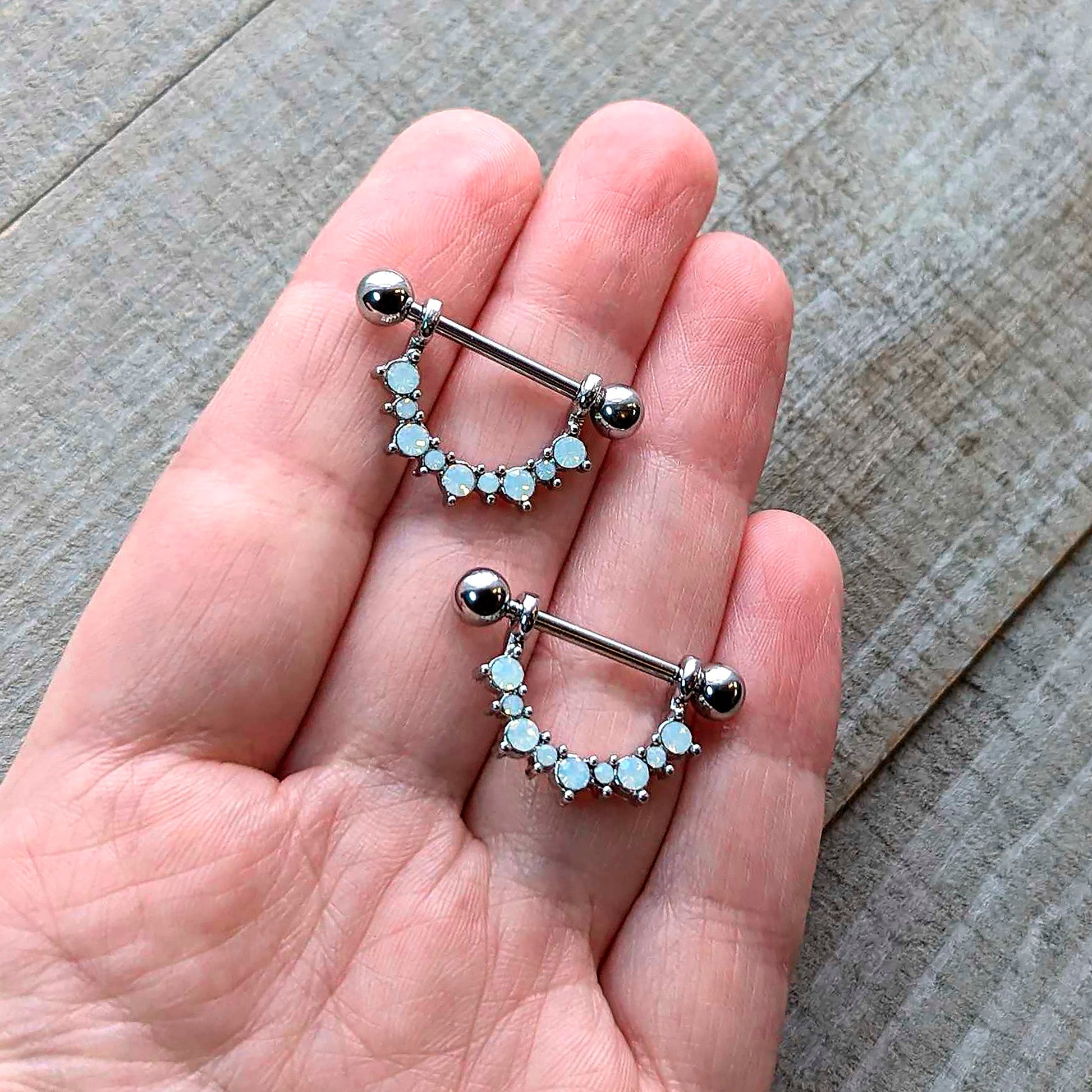 Party like it's your birthday all year long when you are rocking this 14 gauge nipple jewelry. It is made with 14mm durable 316L surgical grade stainless steel straight barbells with 5mm ball ends. Each one features a dangle arch design composed of white synthetic opals that emulate the birthstone for the month of October. Get festive and fabulous all year long with these charming nipple piercing rings. Sold as a set of two.Specifications