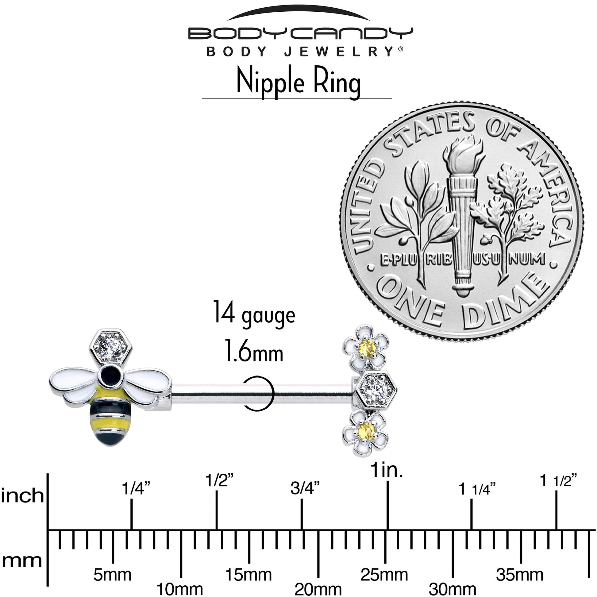 You'll bee the hottest bee in the hive with this 14 gauge nipple jewelry. It's made with 14mm durable 316L surgical grade stainless steel straight barbells. One end features a pair of matching flowers with yellow cubic zirconia centers on each side of a single honeycomb charm with a clear cubic zirconia gem center. The other end features a bee charm with black and yellow stripes and white wings, topped with a clear cubic zirconia gem. Whether you're a worker, a drone, or the queen, you'll be the sweetest looking honey in the room with these elegant honeybee nipple piercing rings. Sold as a set of two.Specifications