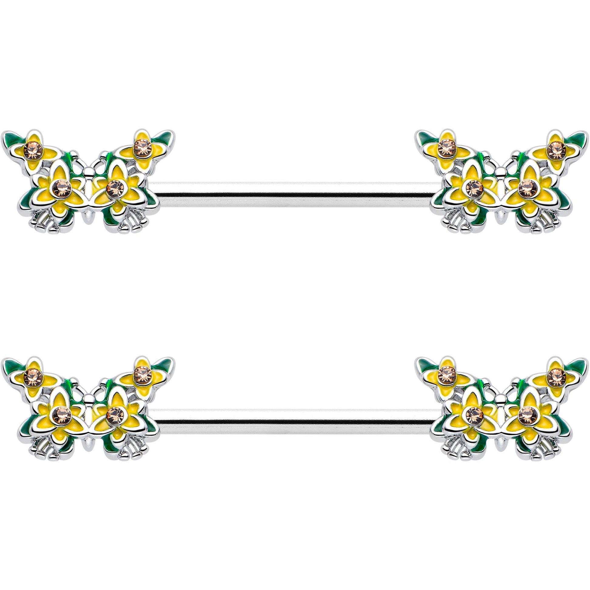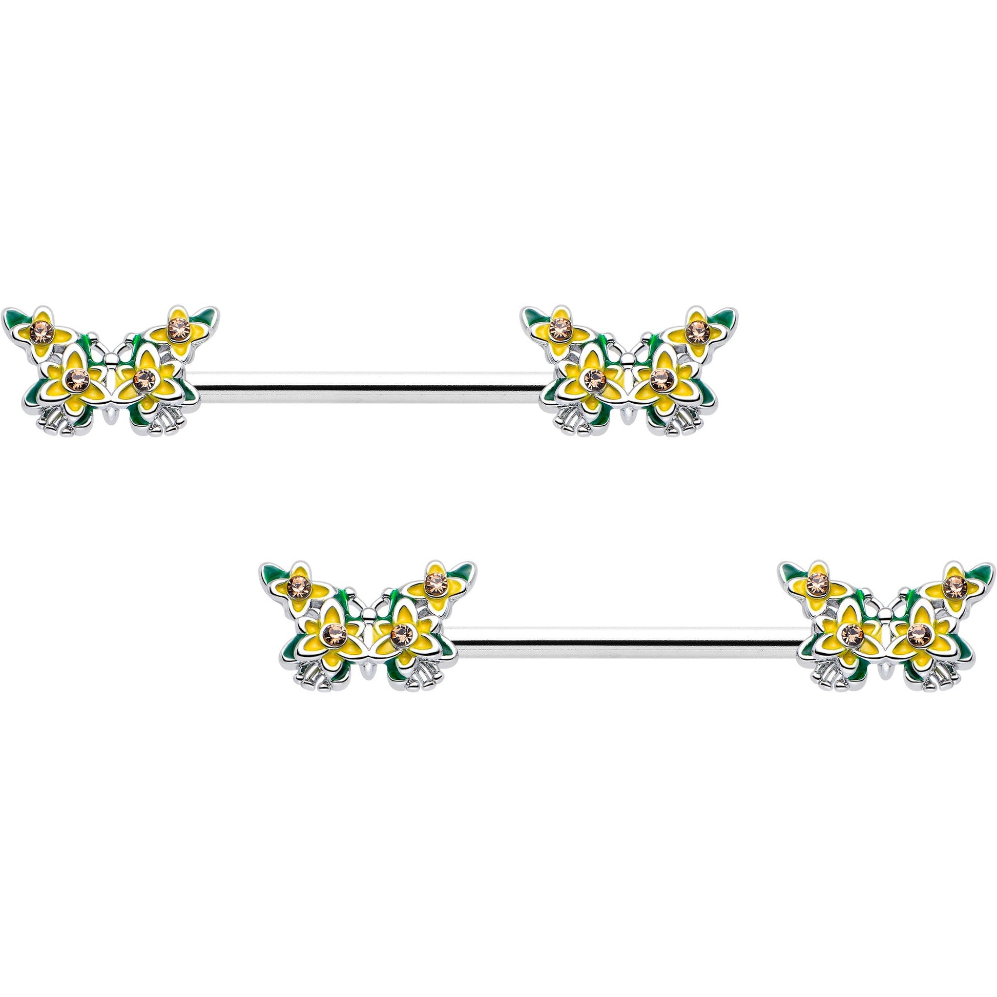 Let your look blossom into something totally new with this 14 gauge nipple jewelry. It's made with 14mm durable 316L surgical grade stainless steel straight barbells. Each of the ends features a butterfly charm, with the butterfly's wings entirely composed of green leaves and yellow flowers. The flowers are further embellished with yellow cubic zirconia gem centers. Spread your wings and fly into style with these fabulous, floral, butterfly nipple piercing rings. Sold as a set of two.Specifications