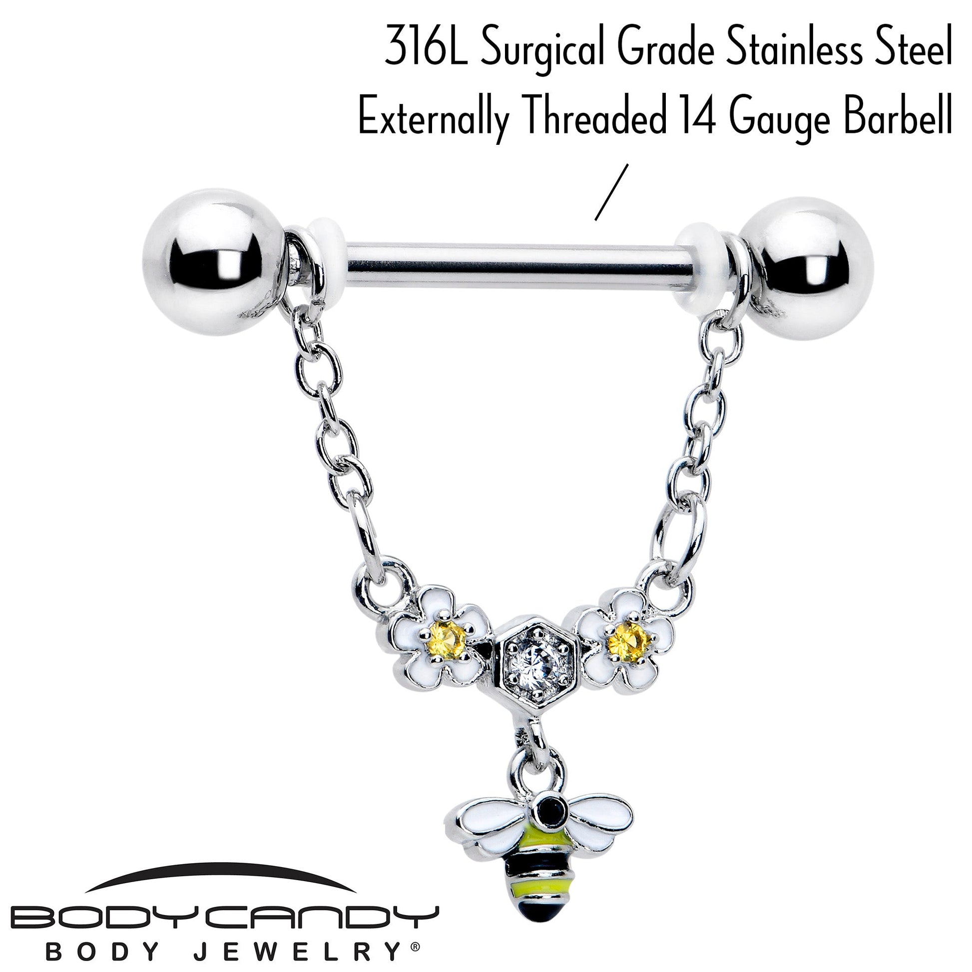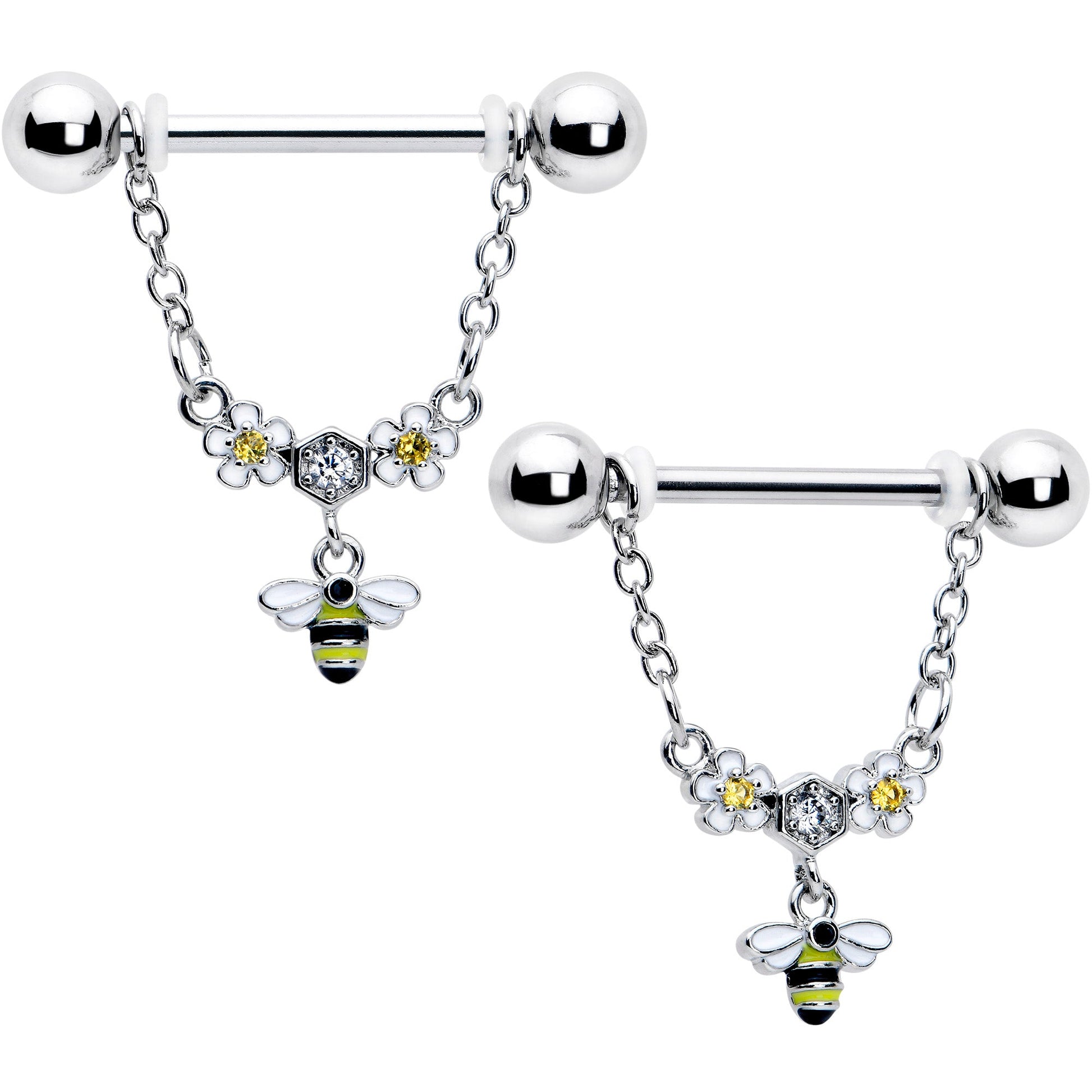 You'll bee the hottest bee in the hive with this 14 gauge nipple jewelry. It's made with 14mm durable 316L surgical grade stainless steel straight barbells with 5mm ball ends. Each barbell supports a double length of chain that features a pair of matching flowers with yellow cubic zirconia gem centers on each side of a single honeycomb charm with a clear cubic zirconia gem center. Dangling beneath is a bee charm with black and yellow stripes and white wings for a cohesive appearance. Whether you're a worker, a drone, or the queen, you'll be the sweetest looking honey in the room with these elegant honeybee nipple piercing rings. Sold as a set of two.Specifications
