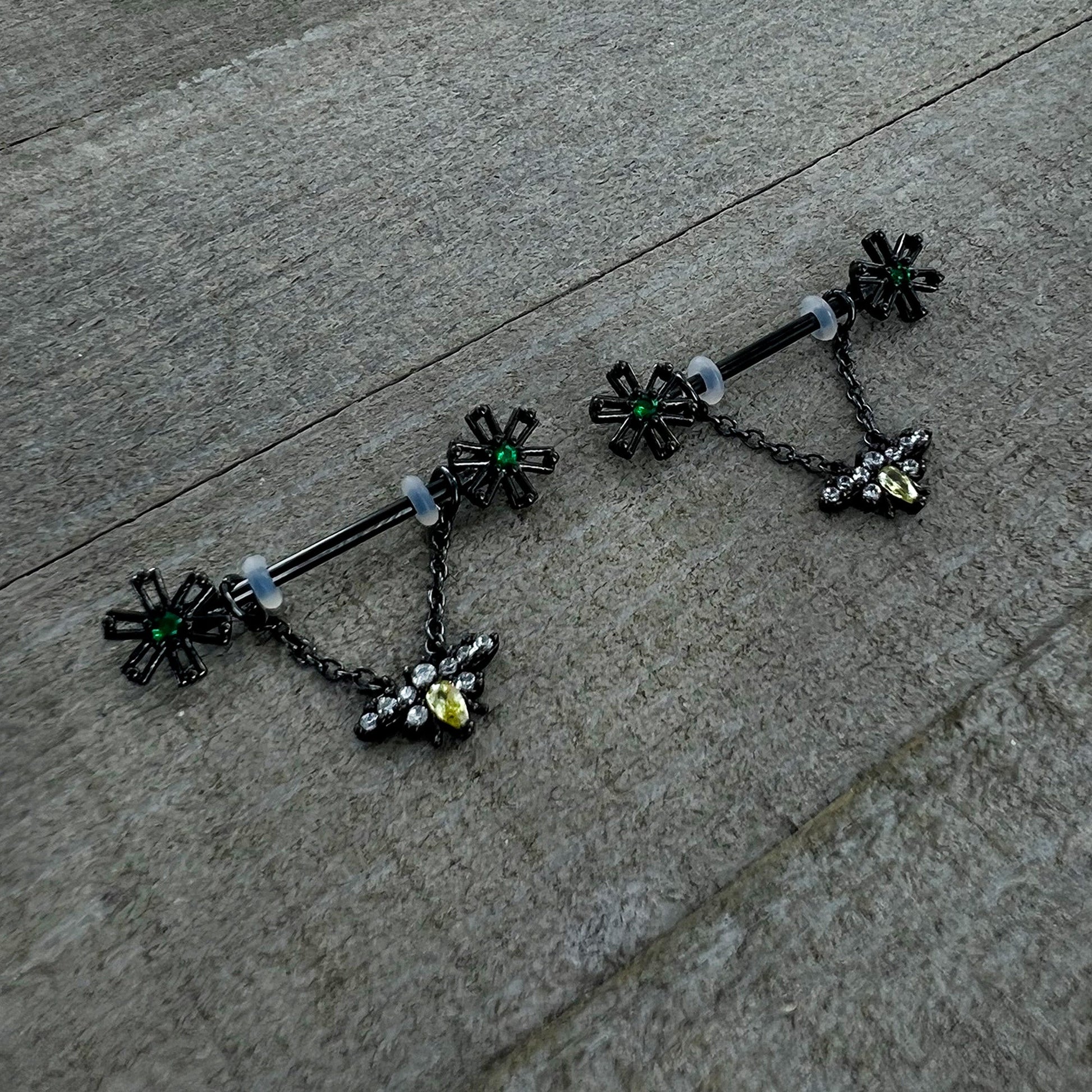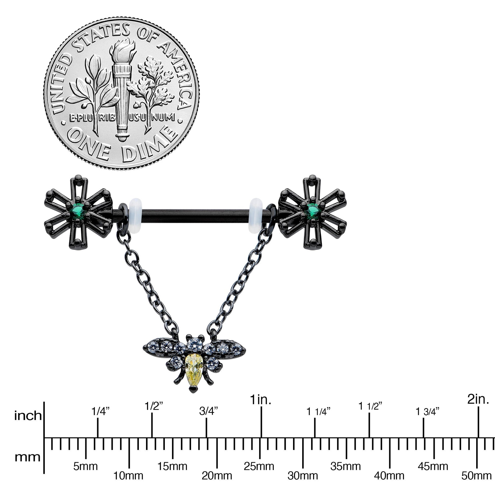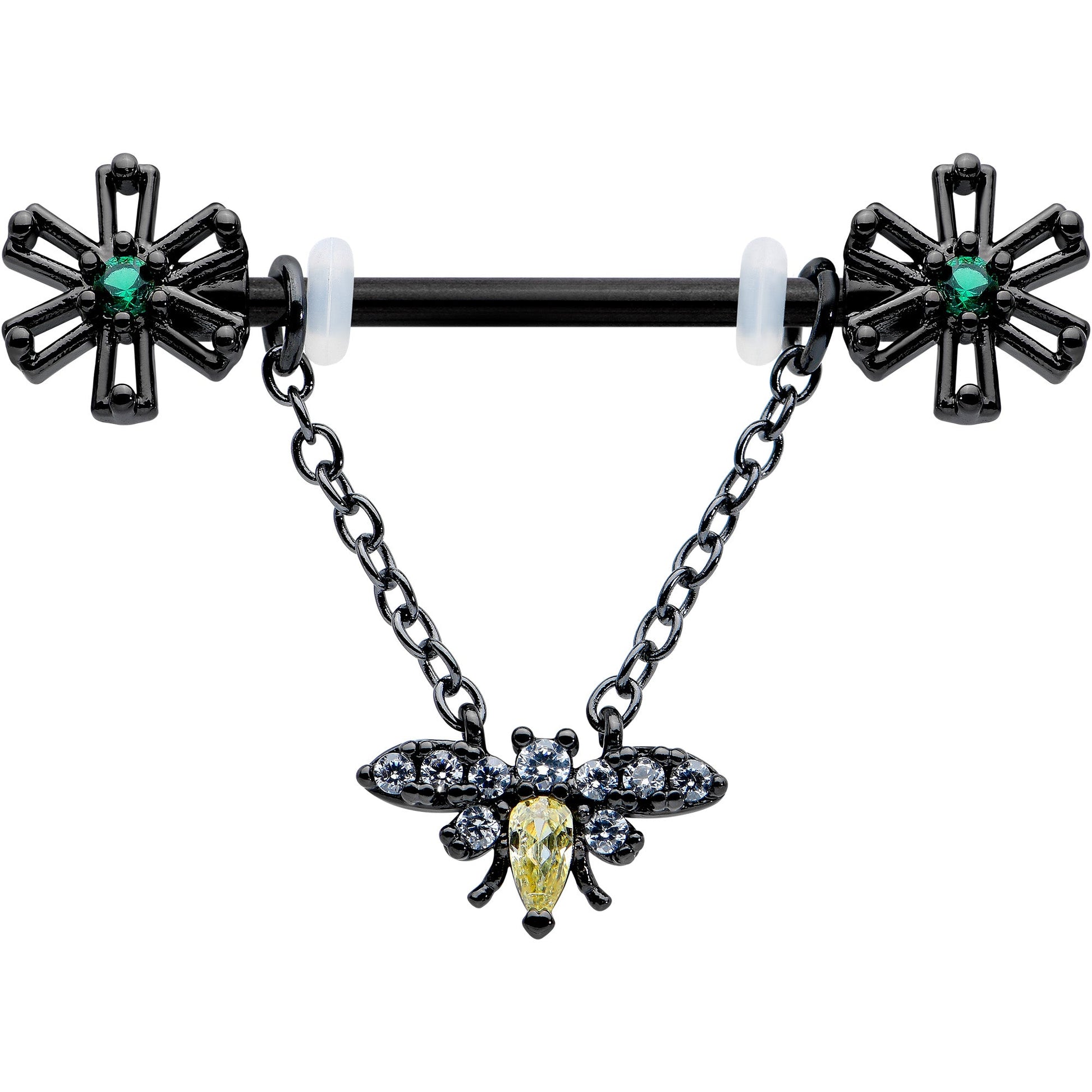 Give your heart a flutter with this 14 gauge butterfly and flower nipple jewelry! It's made with 14mm wearable length black PVD over 316L surgical grade stainless steel straight barbells. Each of the ends features a flower charm, with openwork petals and a green gem center. Dangling from each barbell is a length of black chain that supports a butterfly charm. The butterflies have yellow gem bodies and clear gem heads, while their wings are black and set with matching clear gems. You'll be ready to bloom with these beautiful floral butterfly nipple piercing rings! Sold as a set of two.Specifications