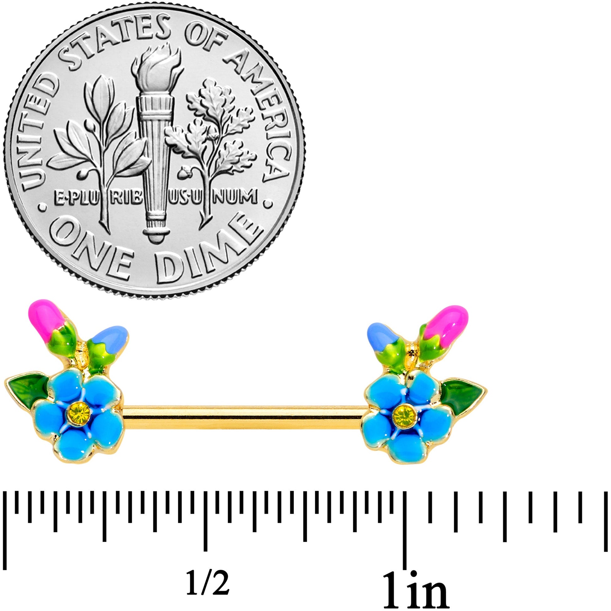 Brighten up your day with the bright, poppy colors of this 14 gauge nipple jewelry! It's made with 14mm gold tone PVD over 316L surgical grade stainless steel straight barbells. The ends feature flower charms with bright aqua petals and a yellow gem set at their centers. The flowers also have a green leaf and are further embellished with a pair of buds underneath in intense lavender and knock-your-socks-off hot pink! If you're searching for a way to add color and style to your nipple piercings, grab your garden shears and pick a pair of neon posies with the concentrated colors of these floral nipple rings! Sold as a set of two.Specifications