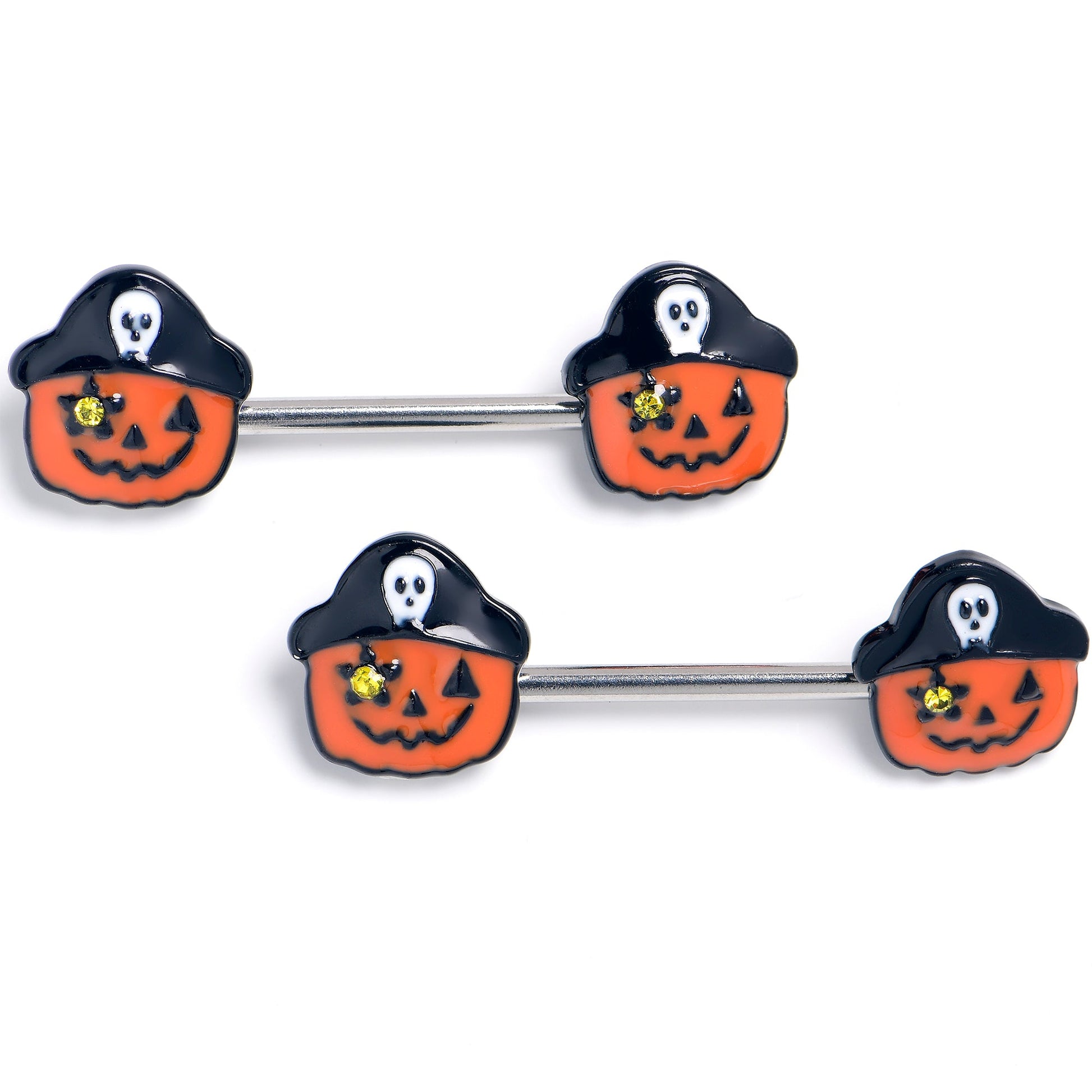 Yar, mateys, there is treasure ahead on this 14 gauge nipple jewelry. It is made with 14mm durable 316L surgical grade stainless steel straight barbells. Each of the ends features a pirate pumpkin charm. The pumpkins each feature a yellow gem eye and black pirate hats with white skulls on them for a truly nautical feel. You can even rock it in multiple piercings including eyebrow, helix, and rook. Pull up the anchor and get ready to sail into spooky style with these pirate pumpkin nipple piercing rings. Sold as a set of two.Specifications