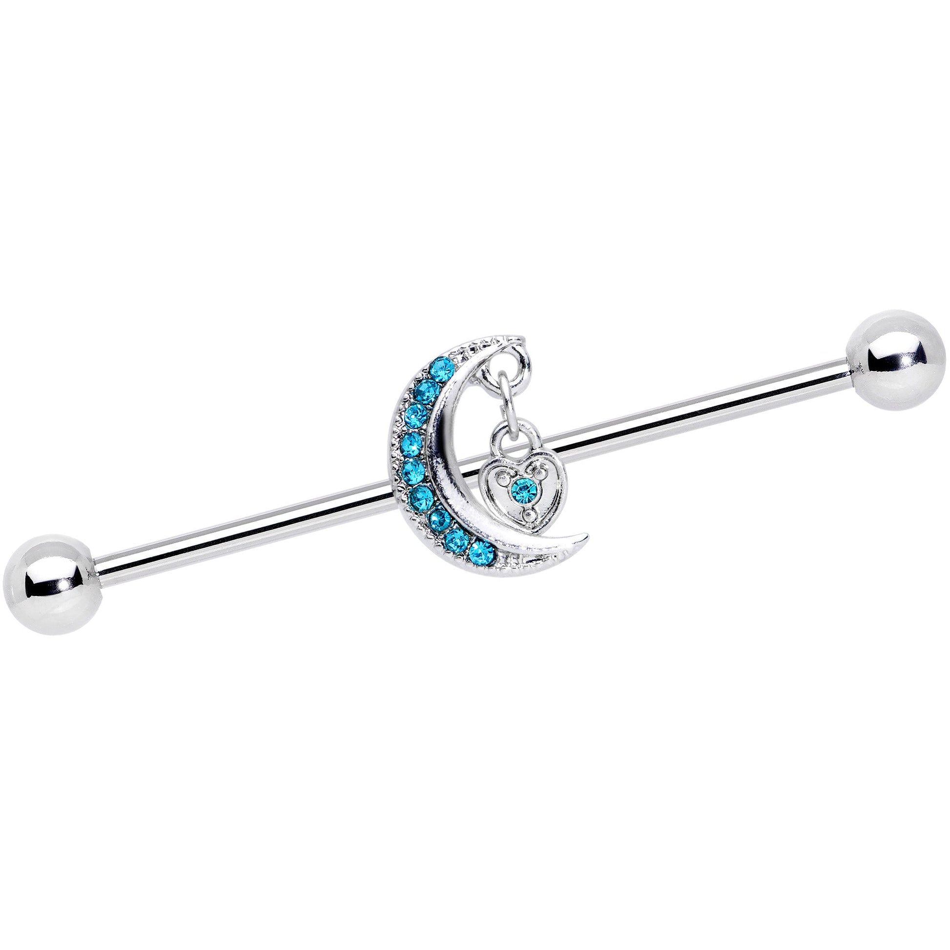 14G Aqua CZ Gem Heart Padlock Moon Dangle Industrial Barbell 38mm