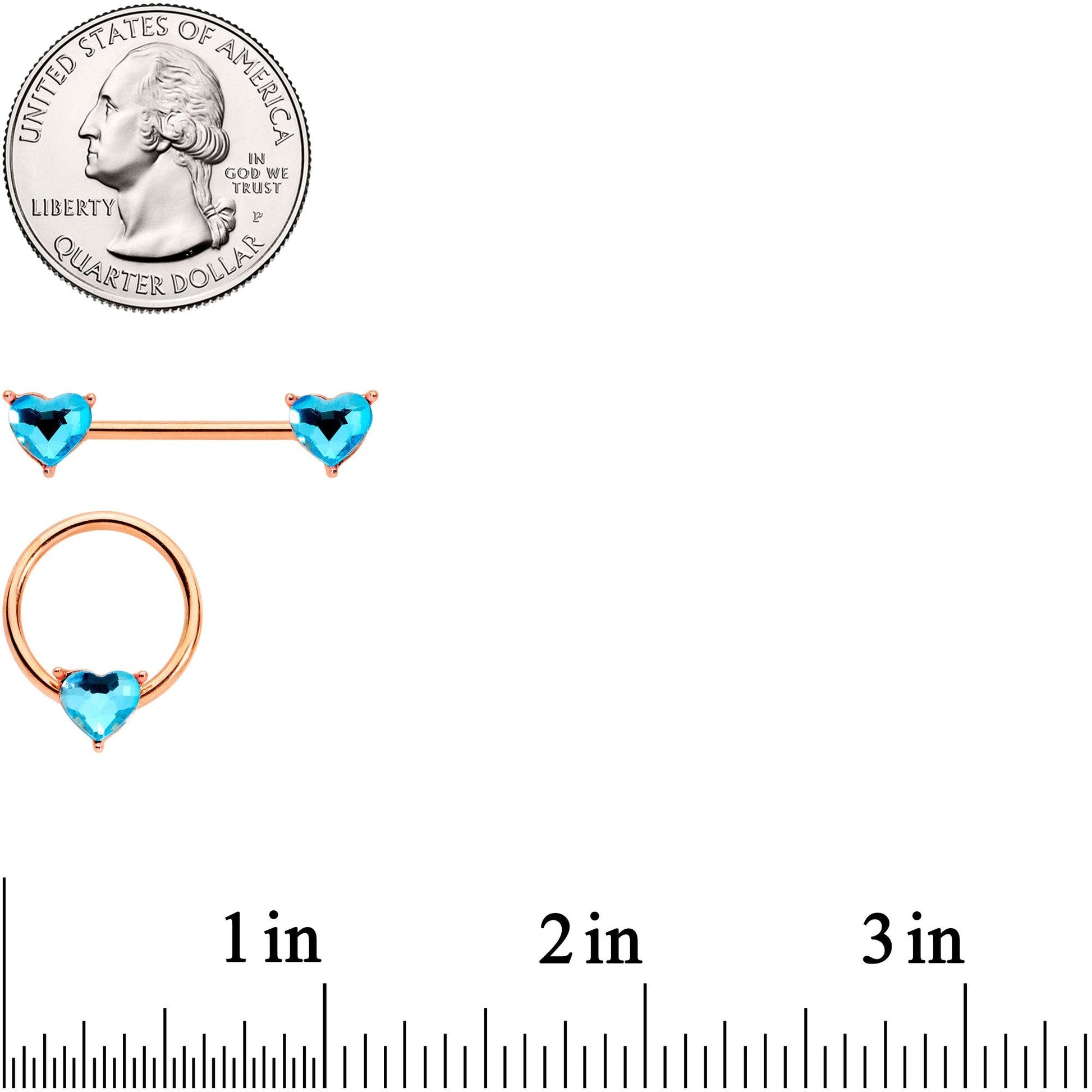 This set of nipple jewelry is perfect for when your heart feels so light it could just float right up to the sky! There are aqua heart-shaped gems on the tips of 14mm rose gold tone plated over durable 316L surgical grade stainless steel straight barbells. There's also a pair of 8mm captive rings clasping matching aqua heart-shaped gems. Those are also made with rose gold tone plated over durable 316L surgical grade stainless steel circular rings. Your body may be earthbound but your heart can soar among the clouds....and your piercings too! Sold as a set of four.Specifications