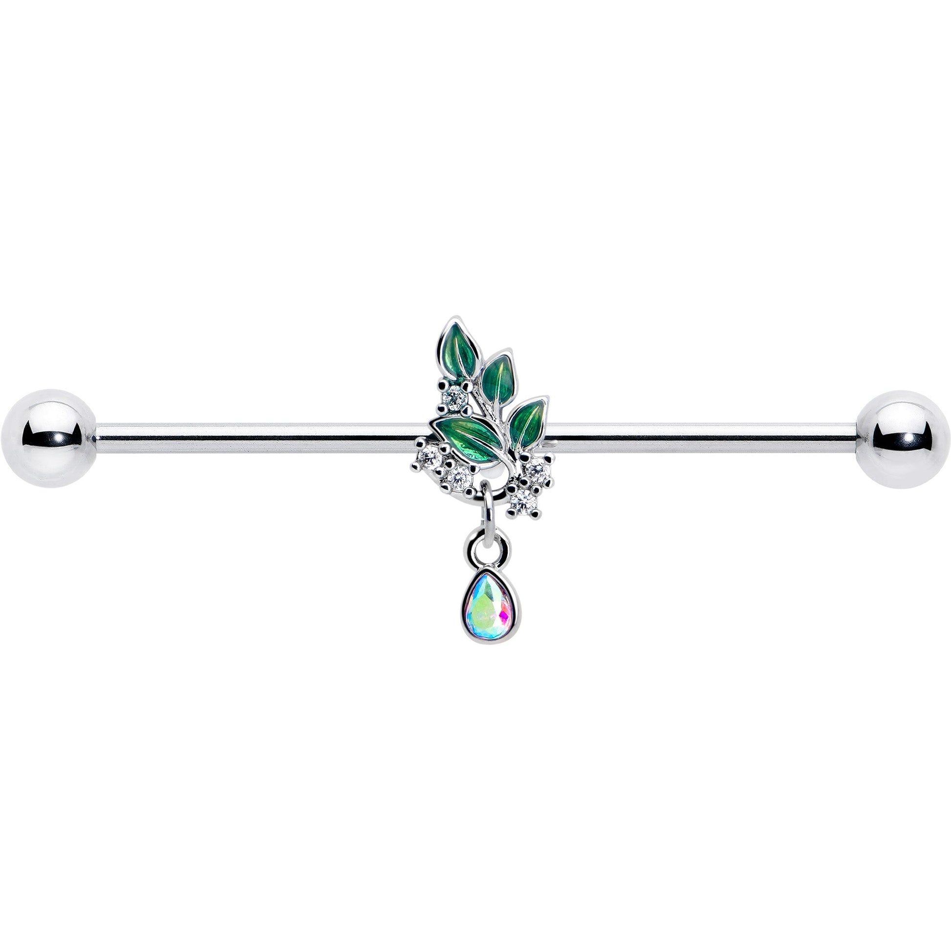 14 Gauge Aurora CZ Gem Morning Leaves Dangle Industrial Barbell 38mm