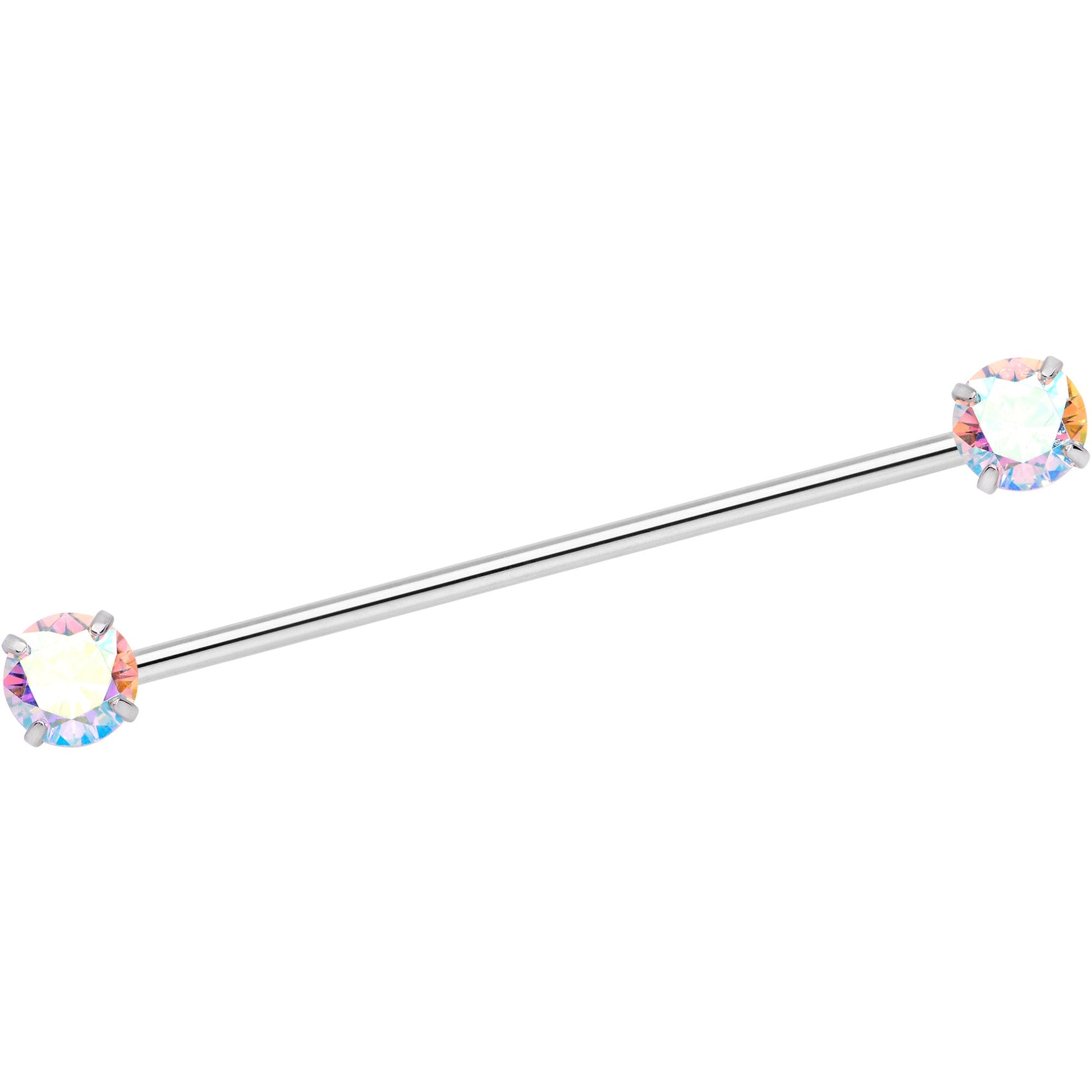 Add some sexy sophistication to your industrial piercing with this 14 gauge helix barbell! It's made with a 1 1/2" durable 316L surgical grade stainless steel straight barbell. The charm ends are threadless round aurora color cubic zirconia gems made to make insertion and removal a breeze while still offering a secure fit. With their easy elegance and uncomplicated sophistication, this barbell earring really does have it all!Specifications