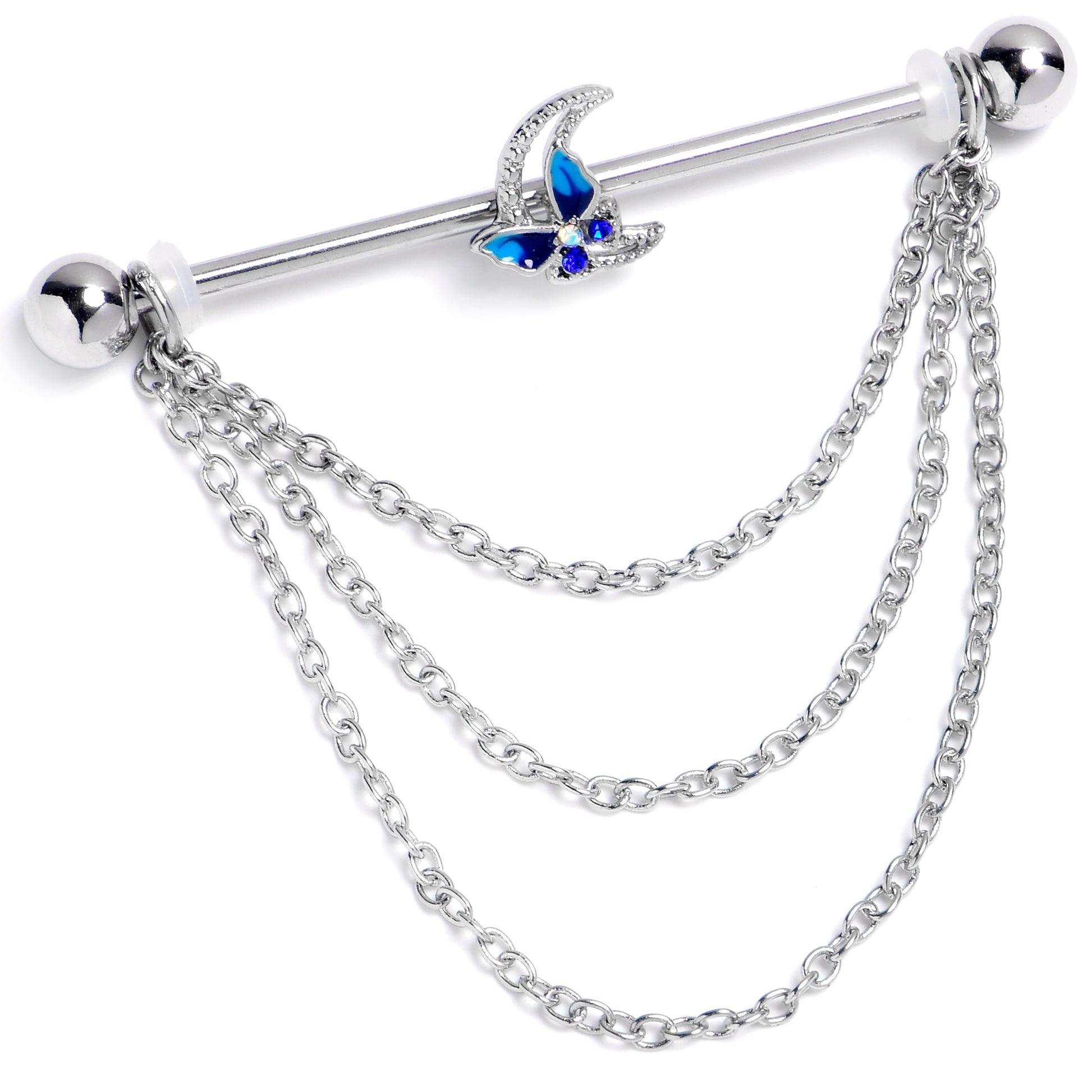 Give your look a charming flutter with this 14 gauge helix barbell. It is made with a 1 1/2 inch 316L surgical grade stainless steel straight barbell with 5mm ball ends. It features a gorgeous butterfly charm, with blue wings and perched on a crescent moon. The butterfly features an aurora gem at the center. Dangling beneath the barbell are three chains and you can slide them up and down the length of the barbell for the perfect look. You will love the beautiful butterfly on this charming barbell earring all the way to the moon.Specifications