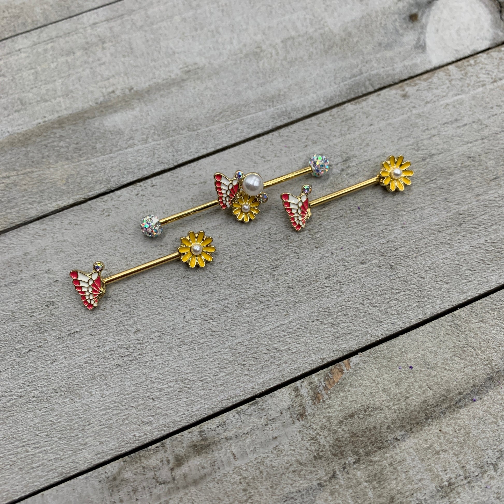 This 14 gauge helix barbell will have you thinking of springtime all year long! It's made with a 1 1/2" gold tone plated over 316L surgical grade stainless steel straight barbell with ball ends that are paved in tiny aurora gems. It features a pink and white butterfly charm perched on a yellow flower. Set around the edges are more aurora color gems and a white pearlescent orb, with a matching orb set at the center of the flower. You can even slide this butterfly up and down the length of the barbell to get just the look you want. Go wild with this beautiful butterfly barbell earring!Specifications
